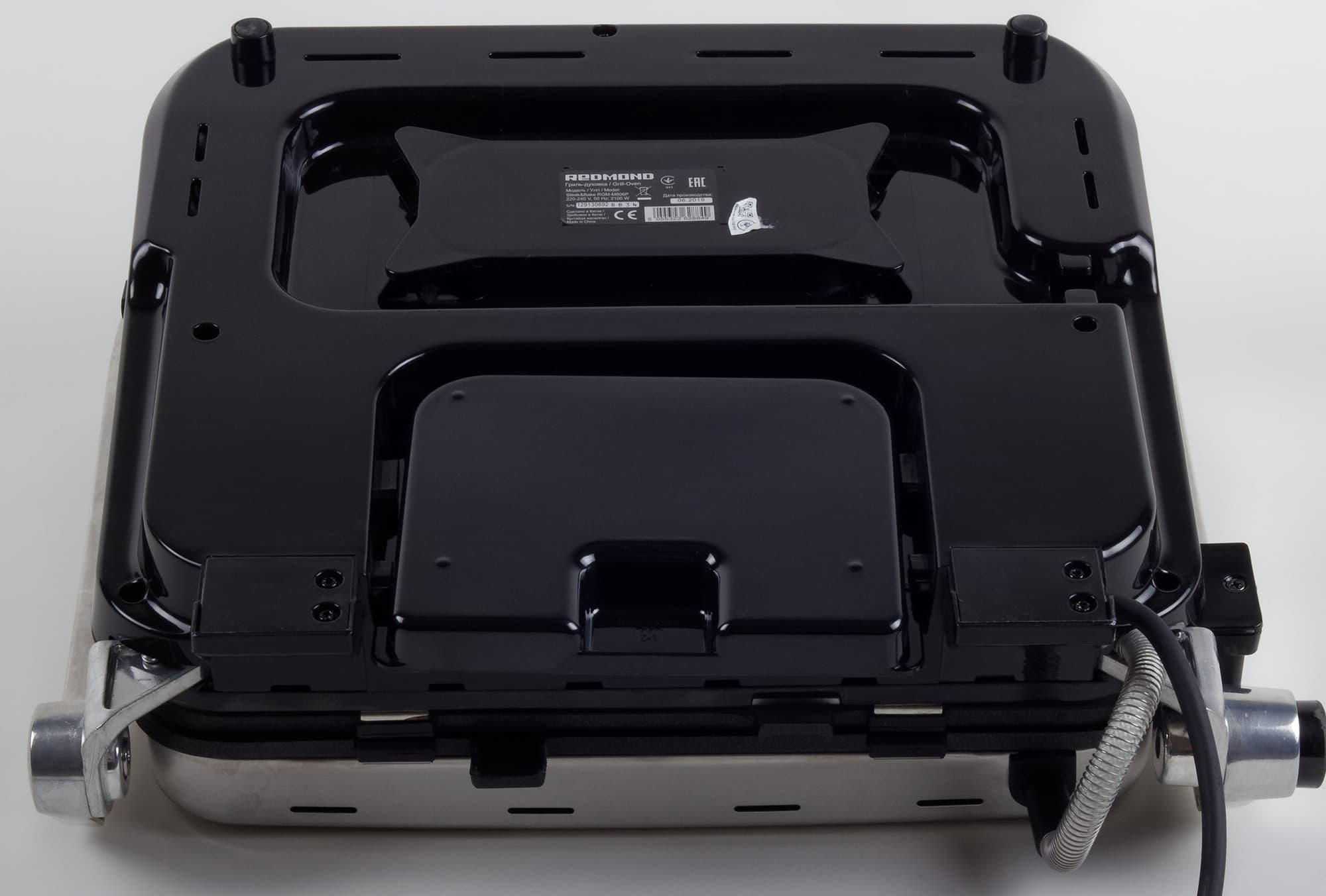 Как и у других представителей семейства грилей компании Redmond, красивая хромированная ручка верхней панели — в своем роде шедевр: она не только удобна для манипуляций с достаточно тяжелой верхней панелью прибора, но и продумана так, что не нагревается и при работе с ней совершенно невозможно (если только не постараться специально) обжечься о гриль.
