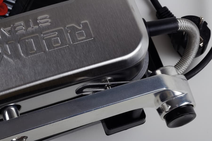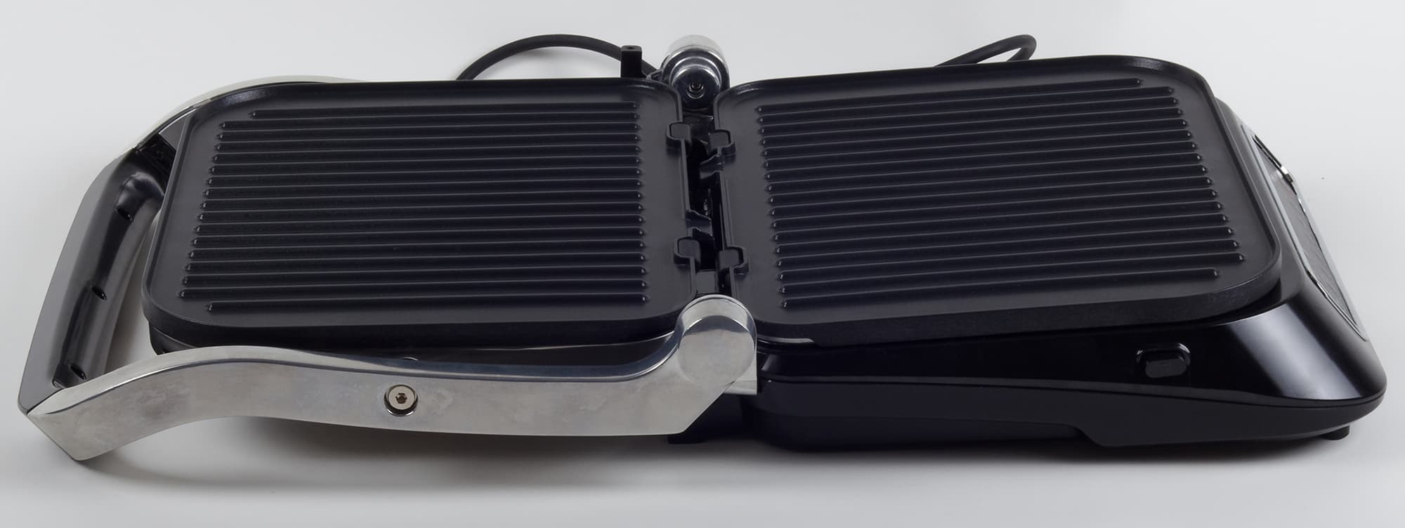 Благодаря тяжелому основанию гриль устойчив как на ровной, так и не на вполне ровной поверхности. Он не переворачивается, даже если его верхняя крышка открыта шире, чем на 90°. Кстати, верхняя панель соединена с нижней не обычными петлями, которые раскладывают гриль, как книжку, а более гибким приводом: таким образом, чтобы верхняя крышка плотно закрыла стоящий на нижней поверхности противень.
