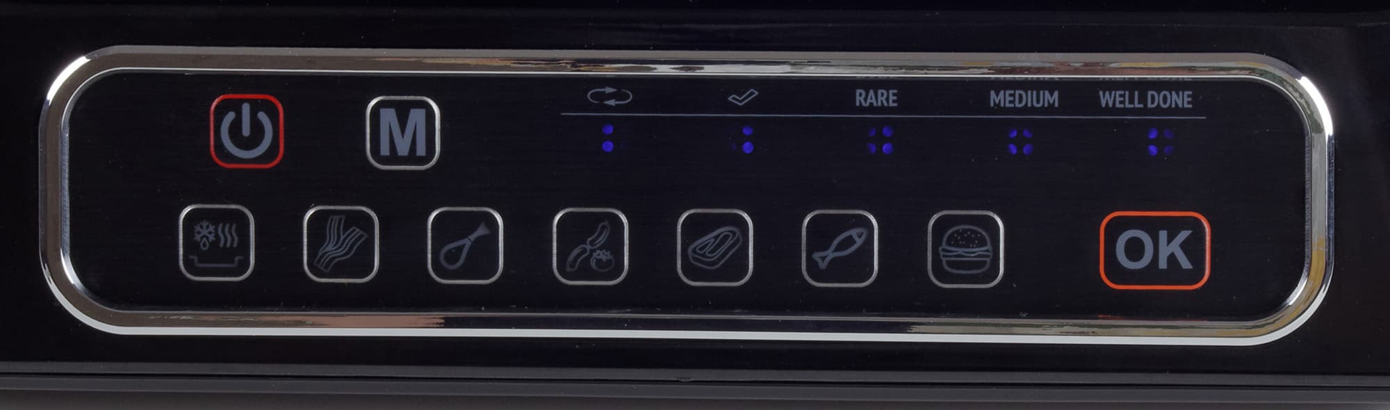 Над кнопками режимов есть ряд индикаторов, которые сигнализируют о разных этапах работы устройства: гриль греется — нагрелся — еда готова в стадии rare — в стадии medium — в стадии well done.