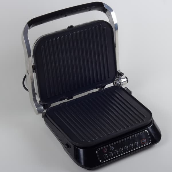 Для использования в режиме барбекю надо нажать на кнопку-ограничитель на боку гриля, тогда верхняя панель откидывается на 180°, и всю жарочную поверхность можно использовать для приготовления пищи.