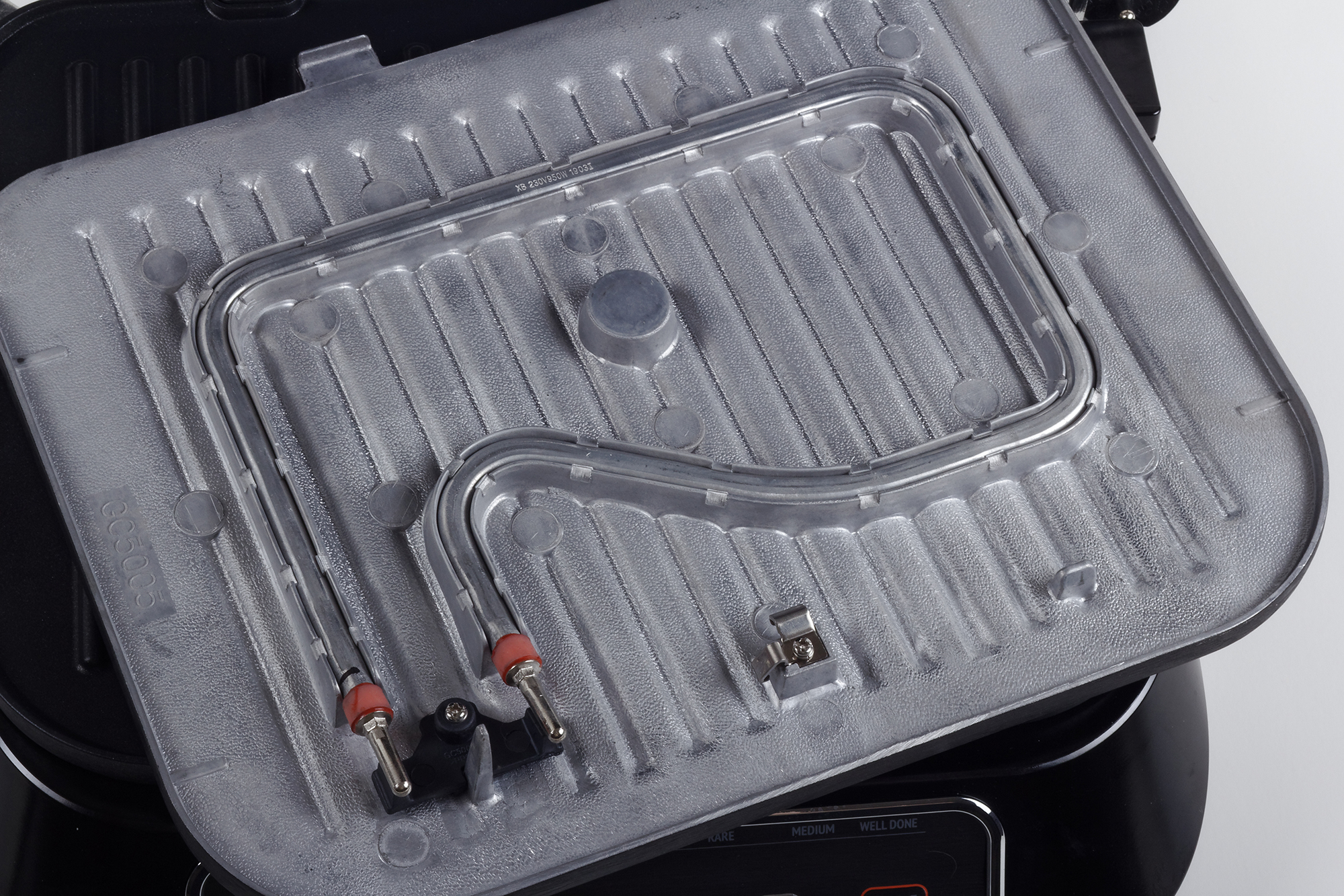 Держатся они надежно, и можно не опасаться перепутать нижнюю с верхней, потому что они одинаковые. С внешней стороны они покрыты хорошим антипригарным покрытием с ребрами и канавками для правильной жарки, а на обратной стороне имеются защищенные от воды нагревательные элементы.