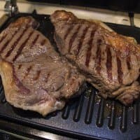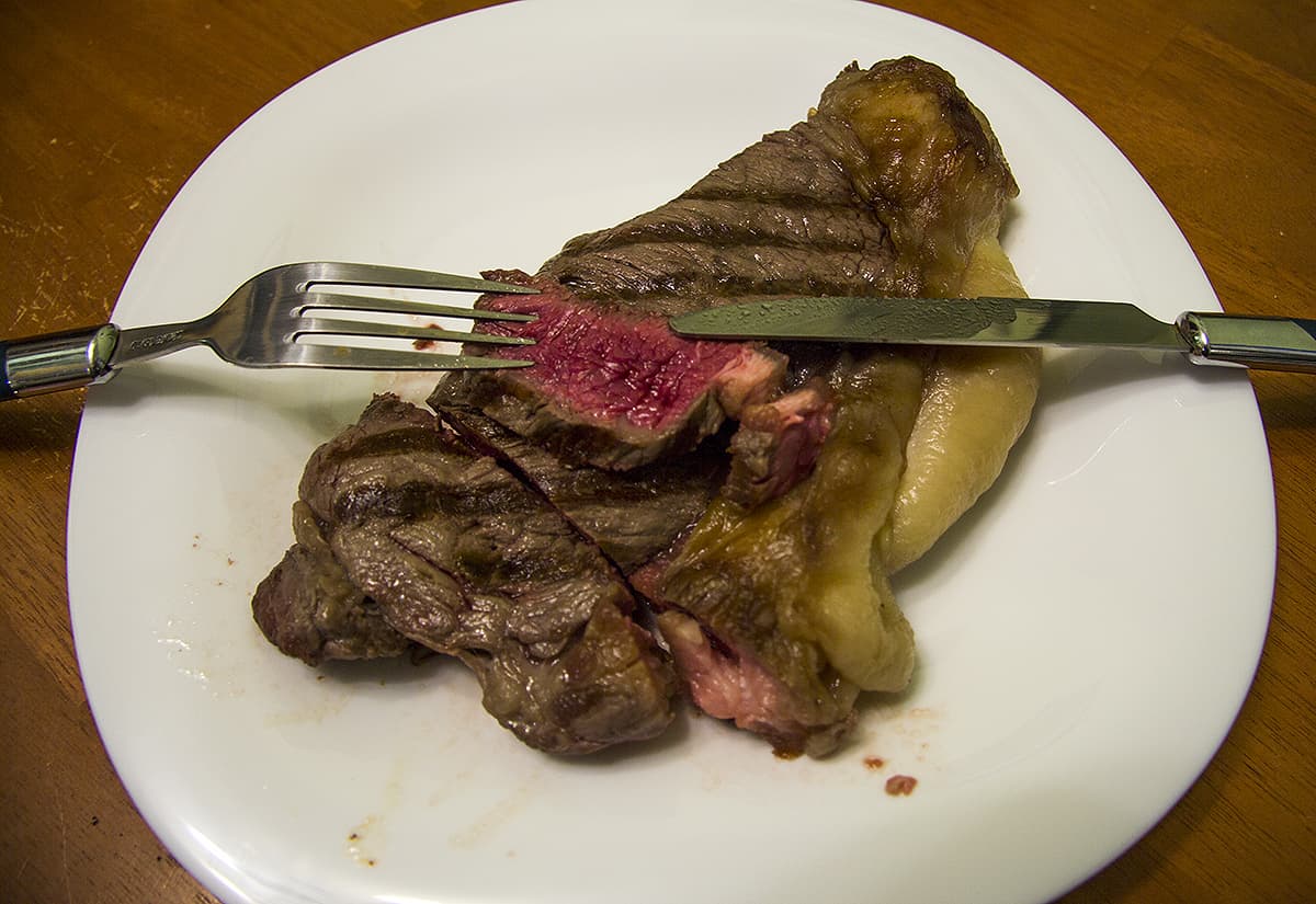 Также мясной режим мы опробовали на свиных котлетах с косточкой. Прожарку выбирали, исходя из вида мяса: свинину, разумеется, готовили максимальное время (получилось чуть меньше 15 минут с разогревом гриля), а на стейках опробовали все три степени прожарки.