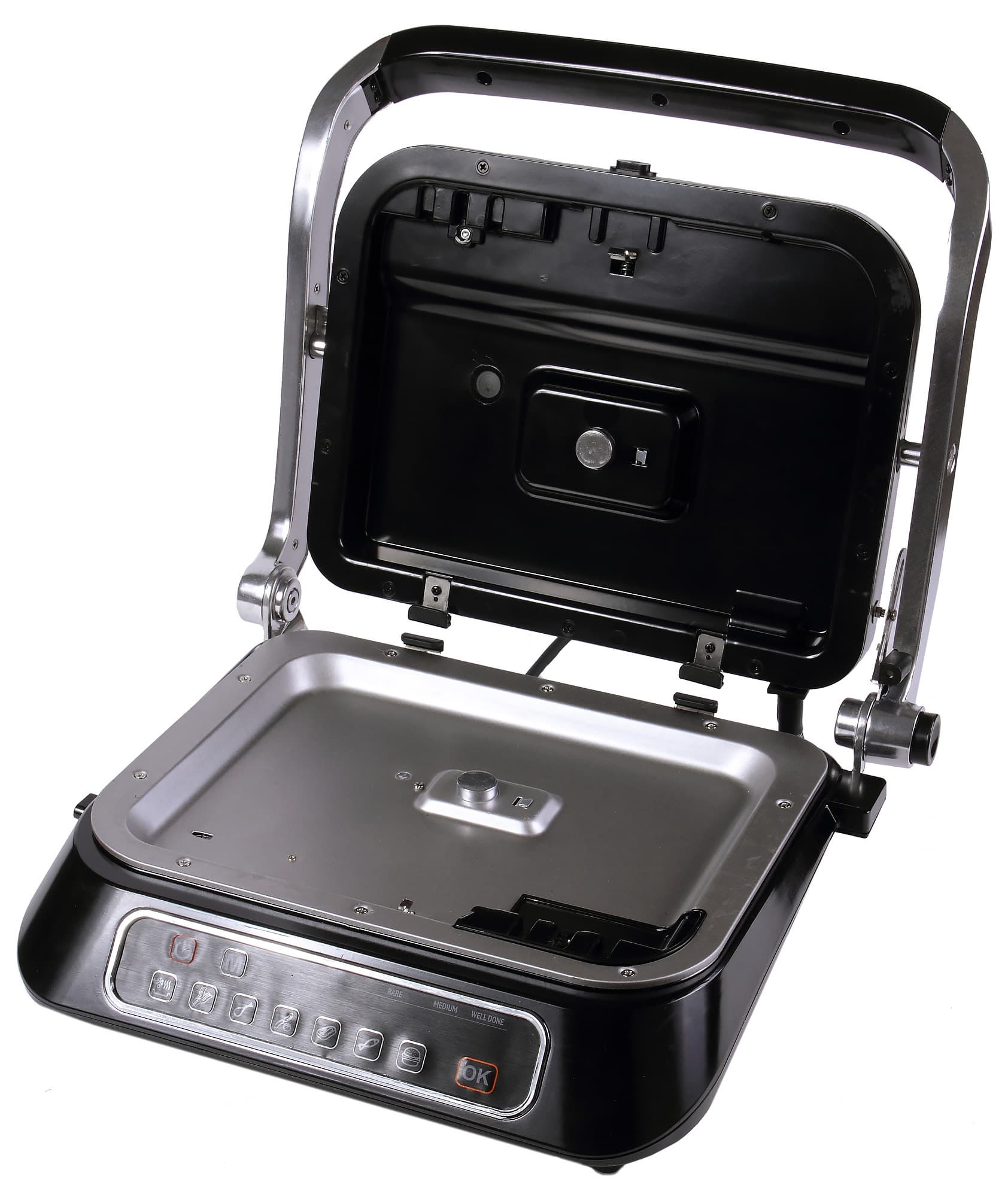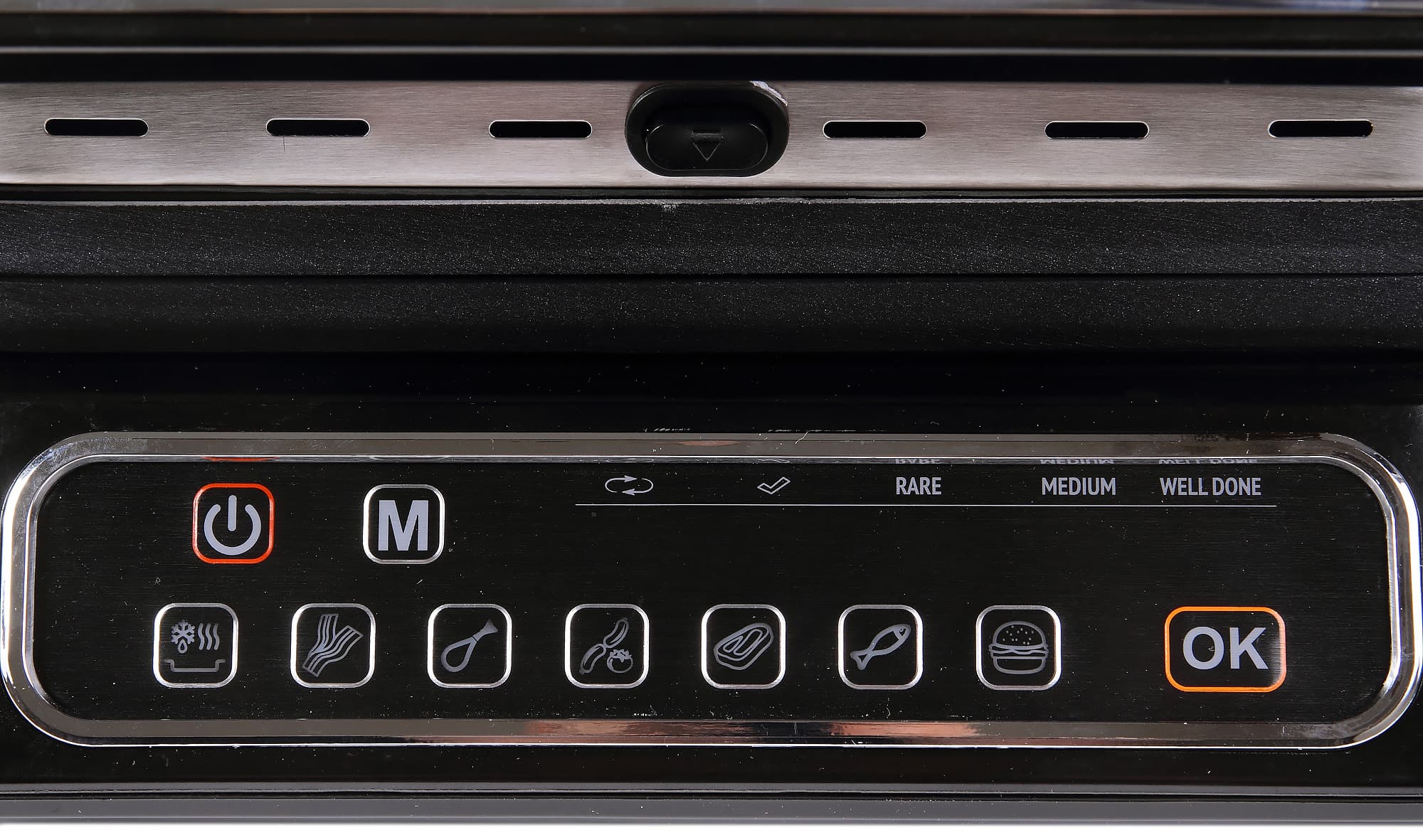 Панель управления расположена на лицевой части гриля. Его передняя стенка слегка скошена назад, чтобы дать пользователю удобный доступ к кнопкам. На панели есть кнопки «Вкл.» и «ОК» — наличие их обеих слегка напрягает, ведь отдельно вынесен ряд кнопок, которые позволяют готовить пищу в предустановленных режимах, зачем же тут еще и «ОК»?