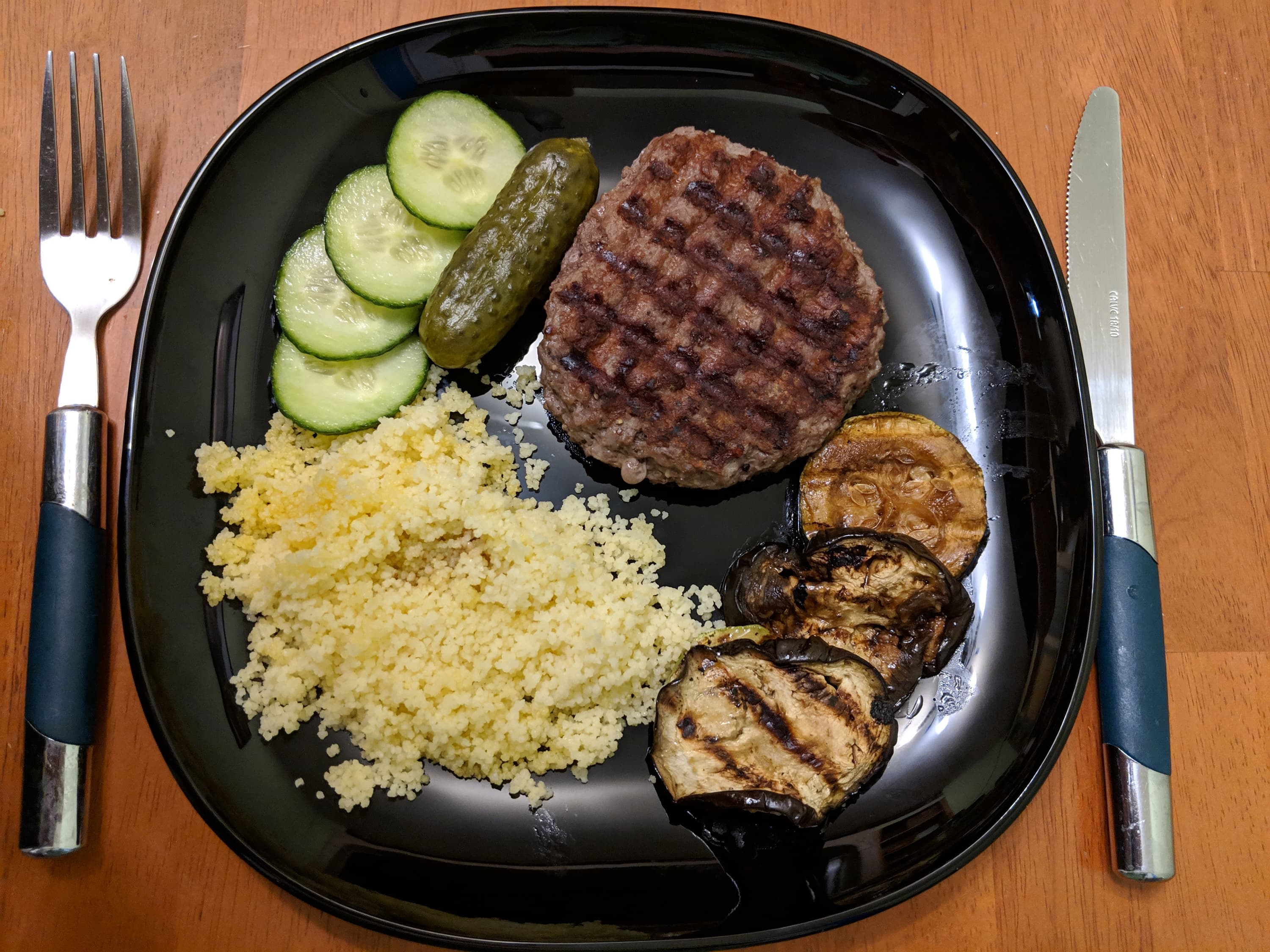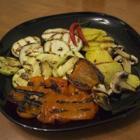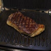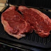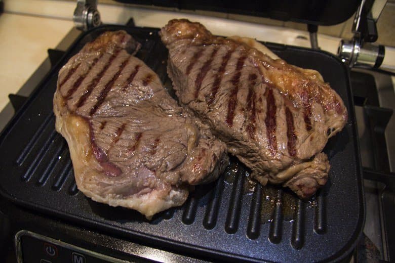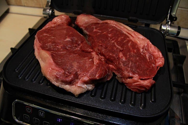 Кусок говядины (стриплойн) разрезали на два стейка и поместили их на разогретый в предустановленном режиме «Мясо» прибор. Первый кусок готовился до стадии rare, второй — well done. Овощи приготовили после мяса, пока стейк «отдыхал» под фольгой.