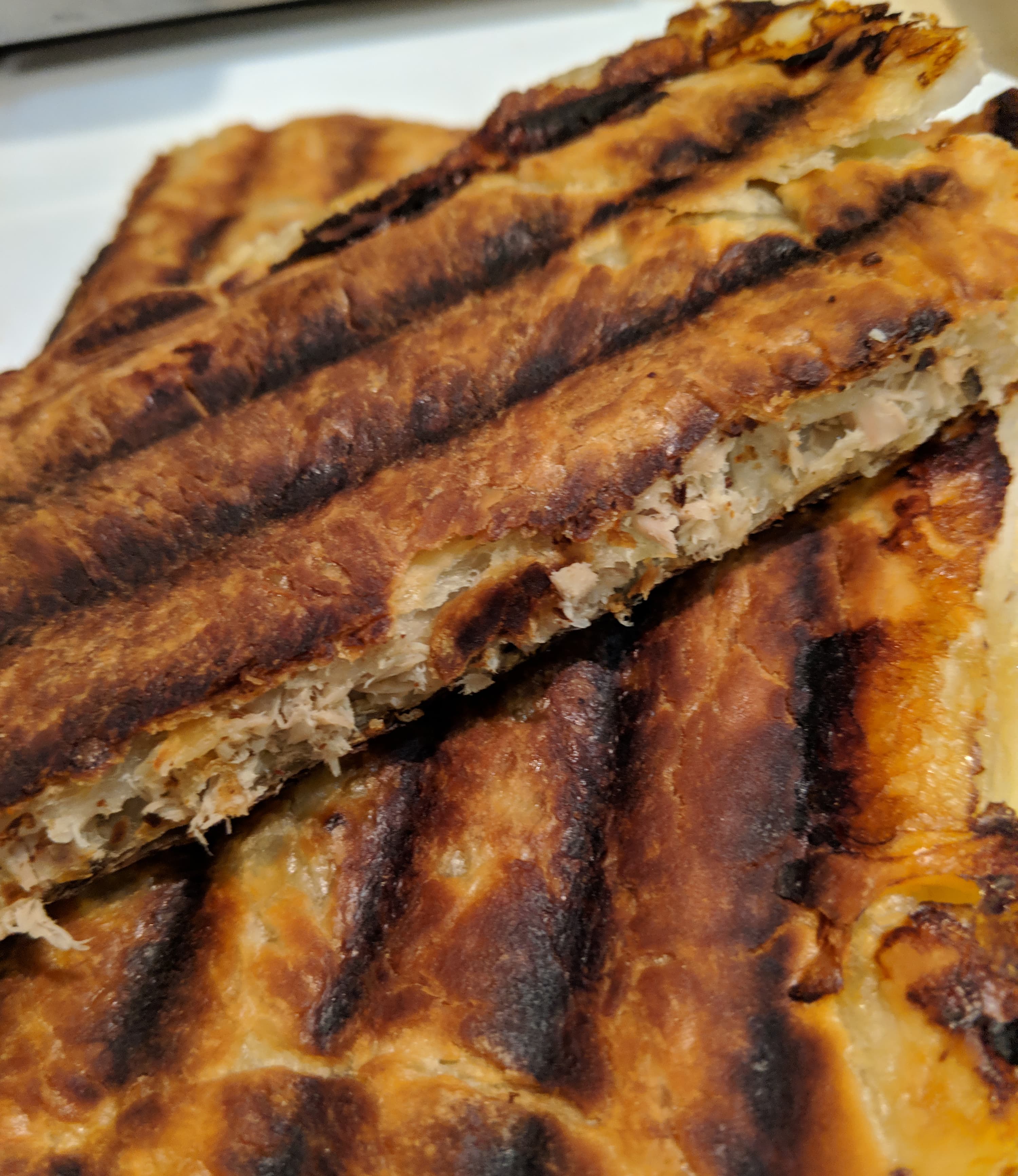 Второй пласт теста пошел на пирог с яблоками и сахаром. Перед этим пришлось остудить прибор и вымыть панели. В принципе, если печь несколько пирогов с одной или сходными начинками, то панели можно только протереть, а вот от запаха рыбы придется отмывать тщательно. Яблочный пирог отличается только начинкой: мелко нарезанные яблоки распределить по нижнему пласту, посыпать сахаром и, если есть, корицей. Защипнуть, положить на разогретый гриль, выпекать примерно столько же.