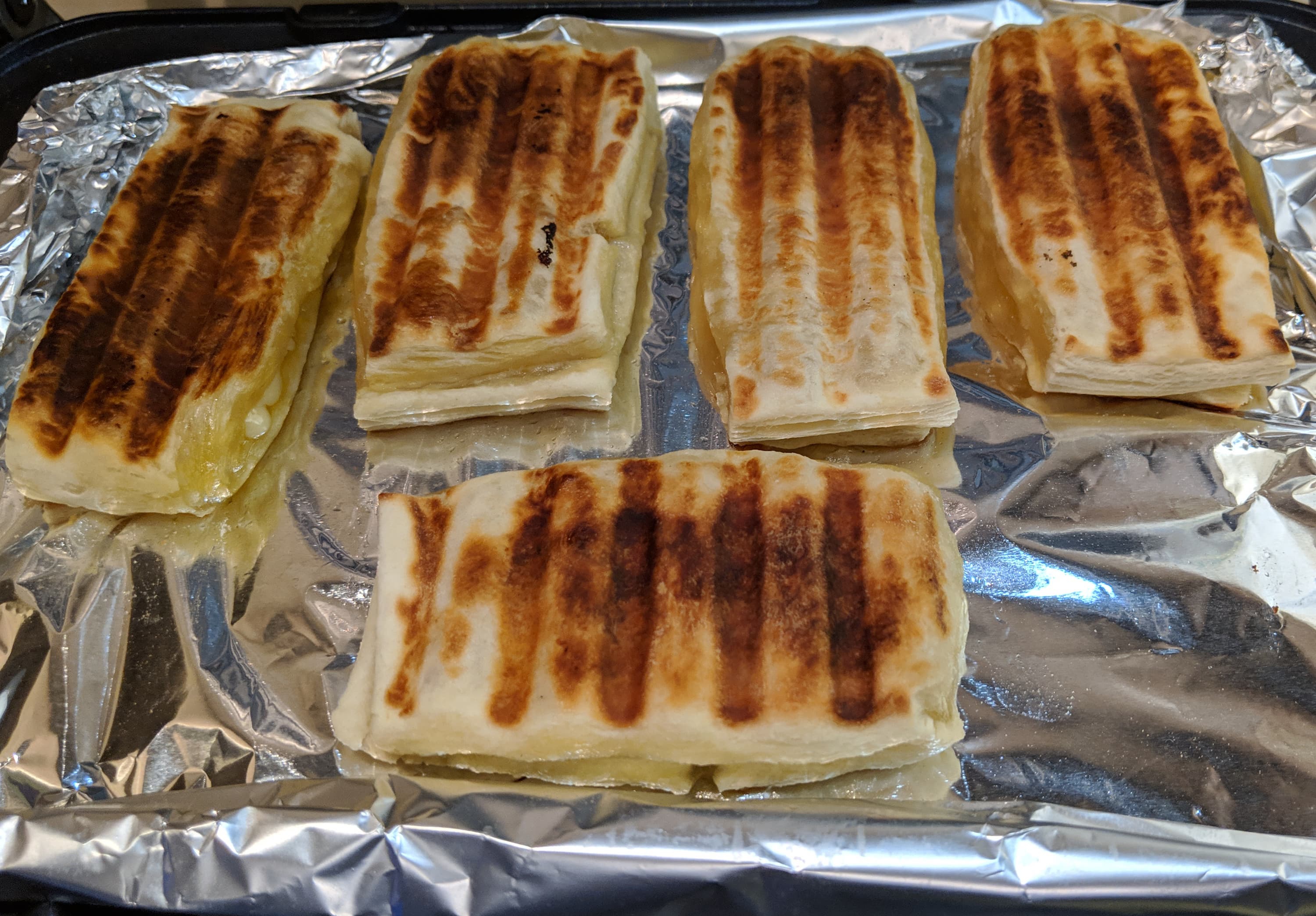 Главное в приготовлении пирогов в гриле помнить, что их придется придавливать верхней крышкой, поэтому начинки надо класть не очень много. Пухлые пироги под гнетом может разорвать, и вся начинка окажется на фольге. А хорошее прогревание тонких пирогов с двух сторон обеспечивает стремительность результата, так что за поведением теста придется смотреть в оба.