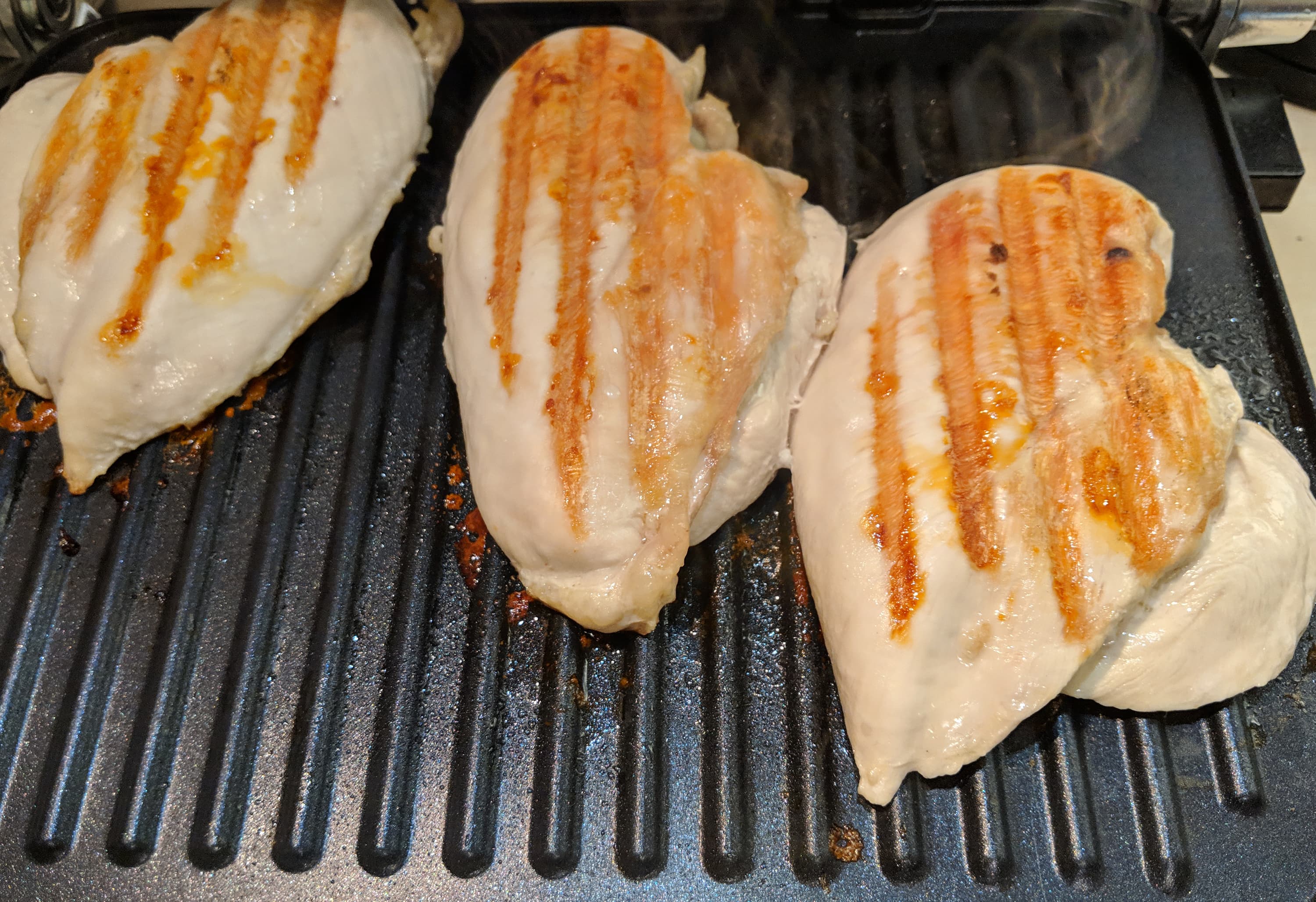 Некоторая видимая неравномерность прожарки связана с тем, что верхняя пластина опускается на мясо под углом, то есть дальняя ее часть не вплотную прилегает к поверхности. Поэтому следы от гриля могут быть более яркими на передней части куска и более бледными на задней. Ничего страшного — можно в процессе открывать верхнюю часть и следить за приготовлением: перекладывать и переворачивать еду, снимать очевидно пережаривающиеся куски и вообще помогать грилю думать.