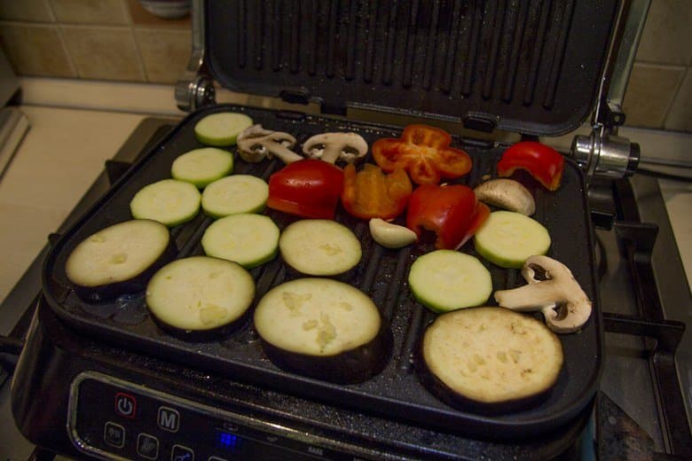 Пирог сверху слегка смазали оливковым маслом и отправили на пластину гриля. В рецепте сказано, что вокруг пирога надо сделать бортик из фольги, иначе слишком сочная начинка может разлиться по всей поверхности гриля. Можно также взять алюминиевую форму, но мы решили поэкспериментировать с бортиком.