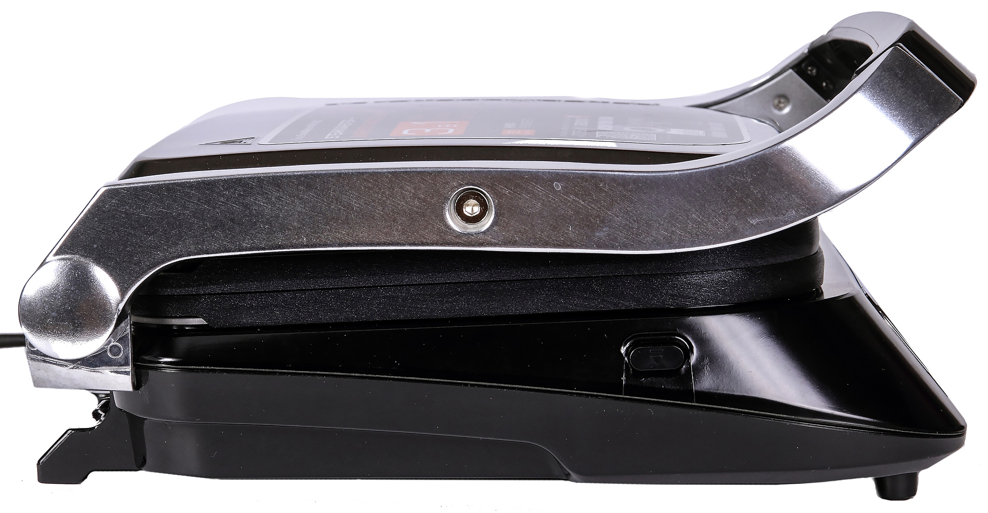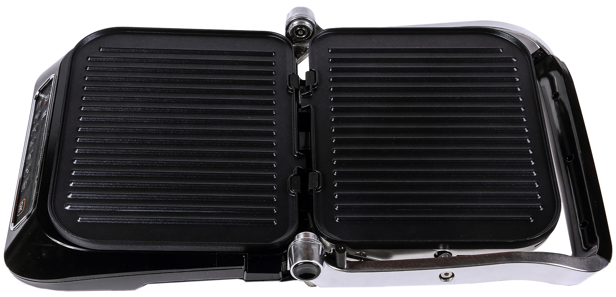 Сразу не понять, почему это устройство советуют использовать в режиме барбекю: ведь в обычном состоянии у нее только одна горизонтальная поверхность, а вторая будет, получается, греться напрасно? Вдумчивое чтение инструкции показывает, что сбоку есть ограничитель: если на него нажать, прибор раскрывается на 180 градусов, и обе панели можно использовать для колбасок, плескавицы и печеных овощей.