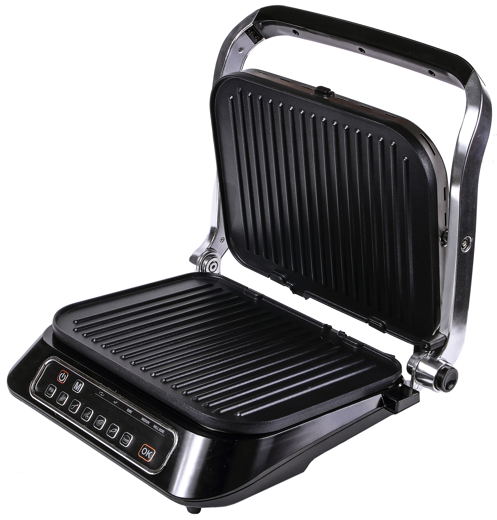Над кнопками режимов есть ряд индикаторов, которые сигнализируют о разных этапах работы устройства: гриль греется — нагрелся — еда готова в стадии rare — в стадии medium — в стадии well done.