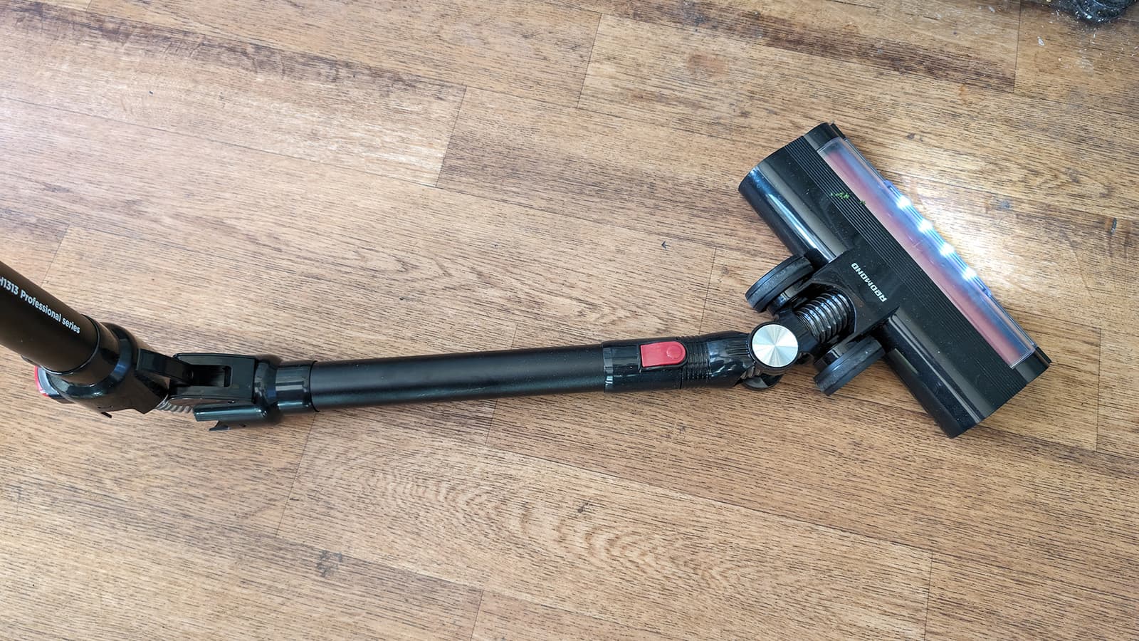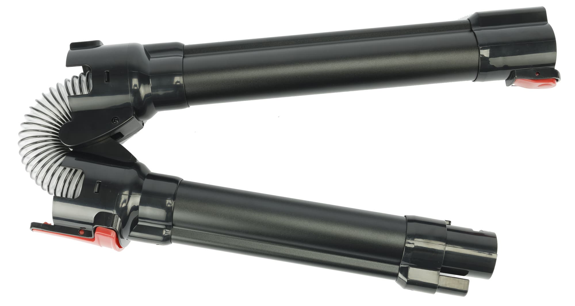 Шарнирная удлинительная трубка оказалась очень удобной. Она позволяет легко убирать под шкафами и диванами на всю длину нижнего колена, при этом сгибаться в три погибели совершенно необязательно. Трубка складывается при нажатии на кнопку в центральной части, что позволяет легко просунуть насадку под мебель. Вернуть в исходное положение также просто: достаточно немного приподнять пылесос — и трубка зафиксируется в прямом положении под собственным весом.