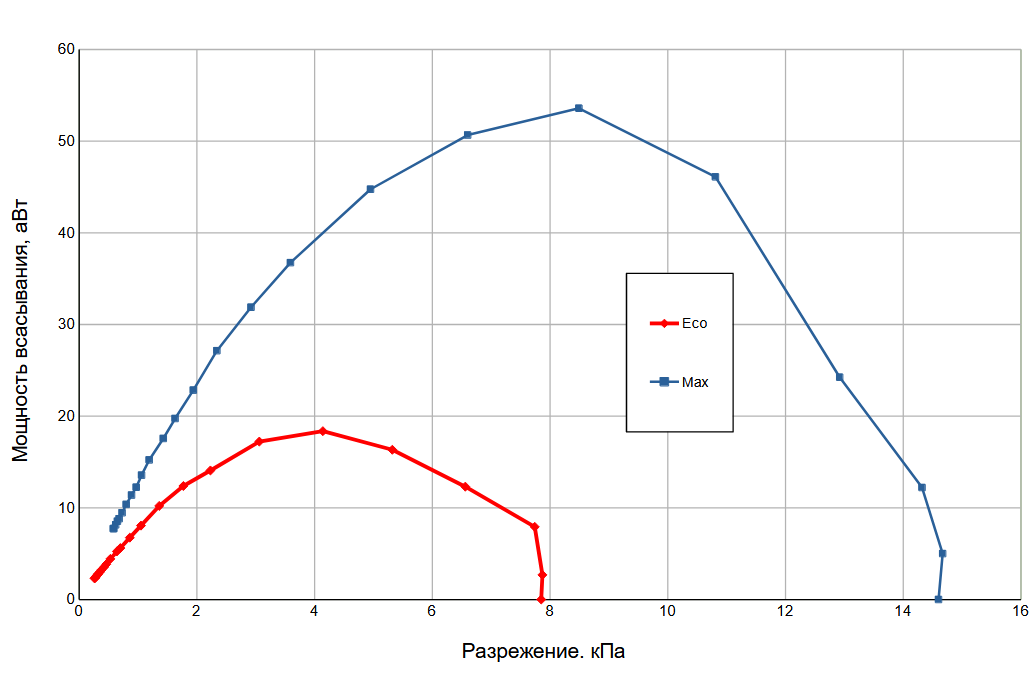 Мощность всасывания (что это такое и как ее измеряем, описано в отдельной статье) мы определяли при работе пылесоса без трубы и насадок, в обоих режимах. Зависимость мощности всасывания от создаваемого разрежения приведена на графике ниже: