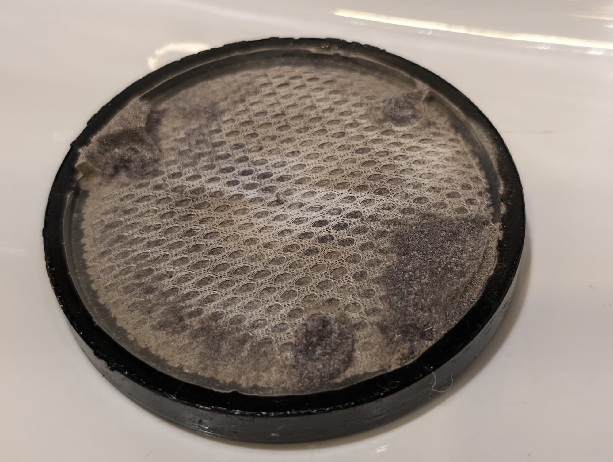 На внутренней поверхности EPA-элемента из нетканого материала скапливается сравнительно много мелкой пыли. Однако преодолеть фильтр тонкой очистки грязь не может: внешняя поверхность диска после нескольких уборок лишь слегка потемнела.