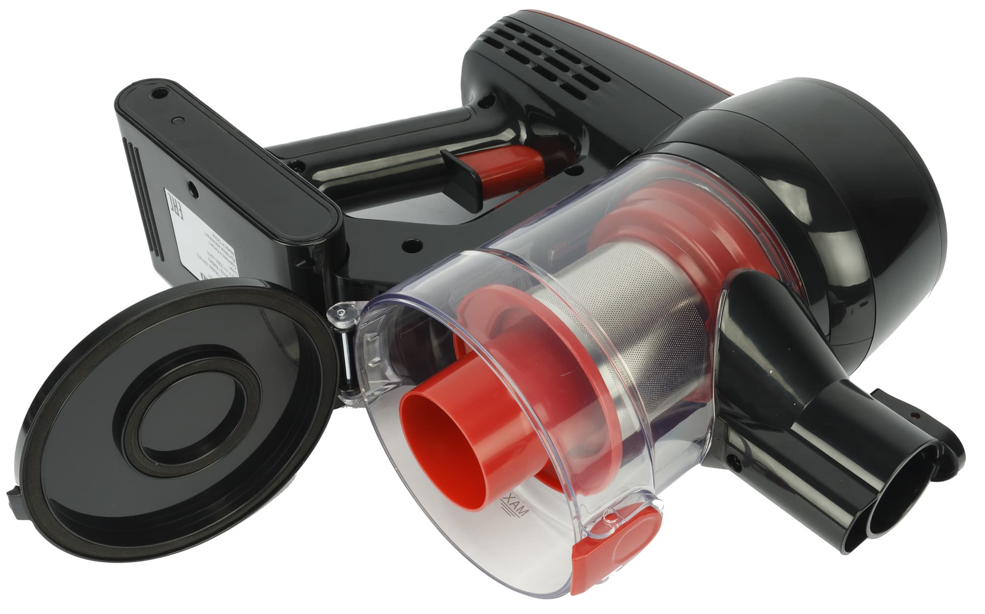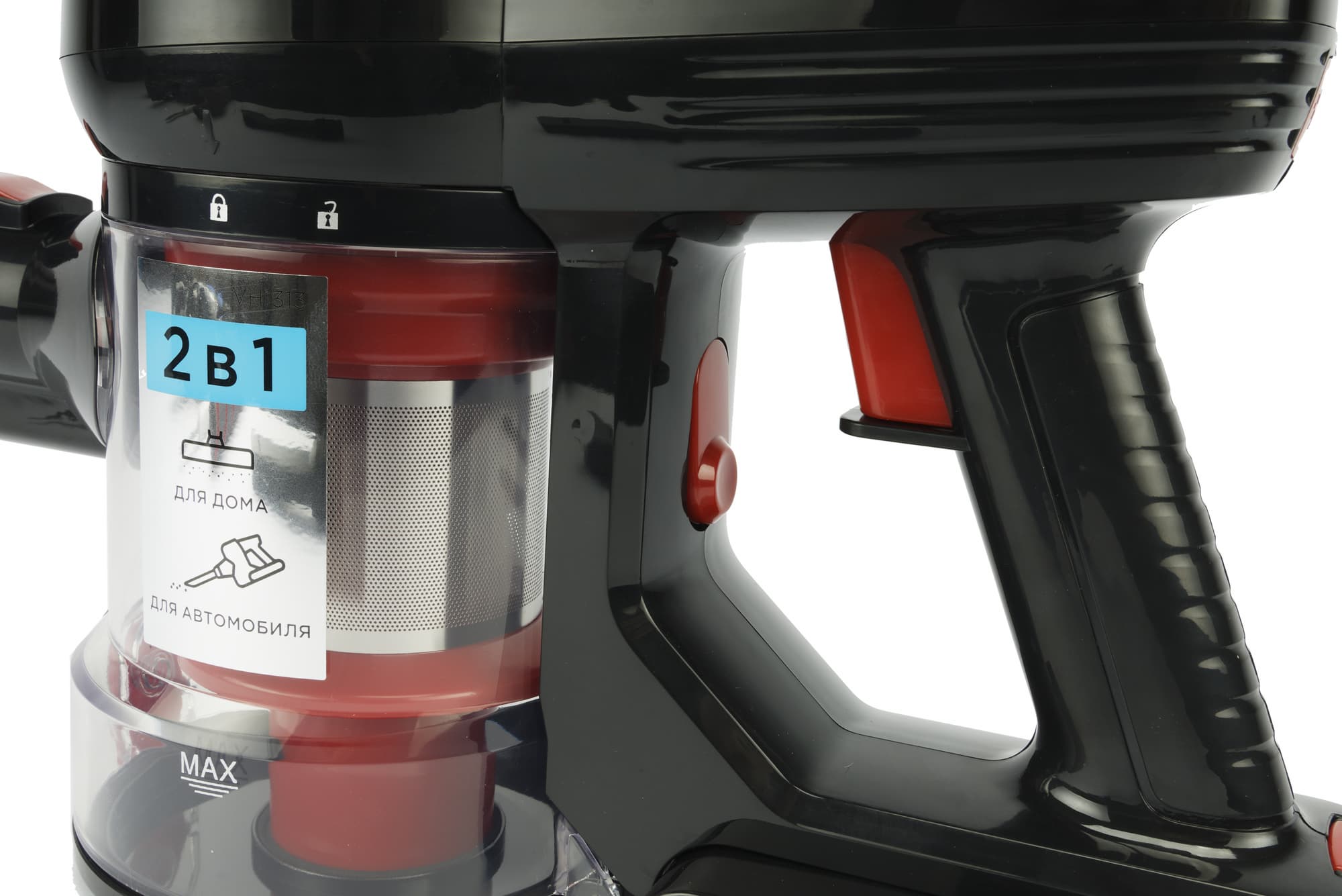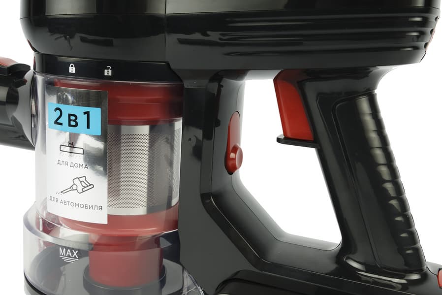 Включается и выключается пылесос «спусковым крючком» на пистолетной рукоятке. Это одинаково удобно делать и правой, и левой рукой. Кнопка на корпусе напротив ручки служит для фиксации контейнера с мусором.