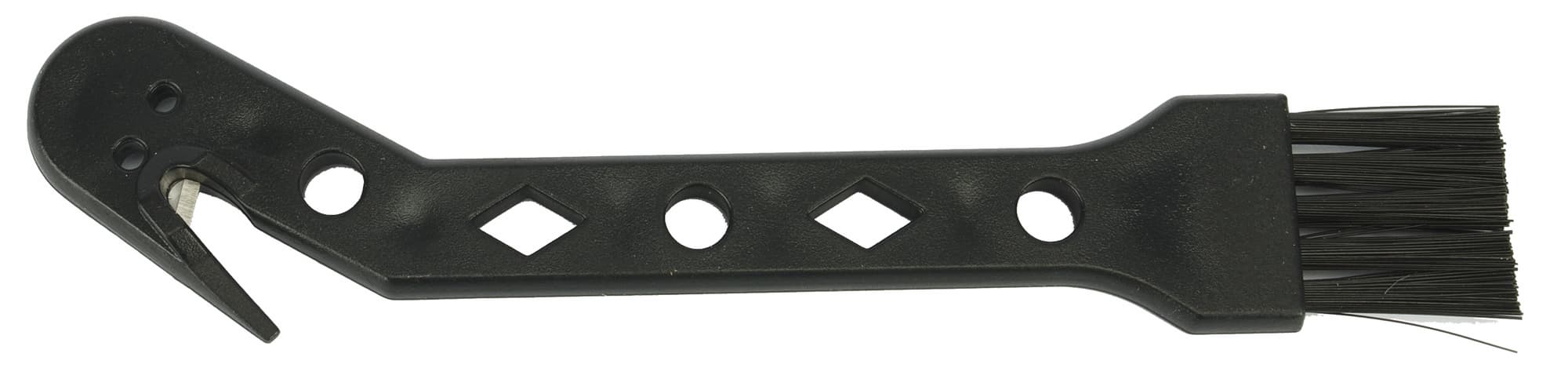 Приспособление для чистки состоит из небольшой щетки для очистки системы фильтрации и лезвия, предназначенного для срезания с роторной щетки неизбежно наматывающихся на нее ниток и длинных волос.