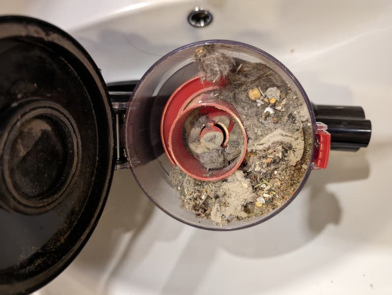 Откидная крышка на торце емкости позволяет высыпать большую часть мусора в ведро, не запачкав рук. Часть загрязнений, тем не менее, скапливается выше пластиковой «юбки» циклона — между сеткой и стенками резервуара. Чтобы удалить их полностью, следует извлечь центральный элемент.