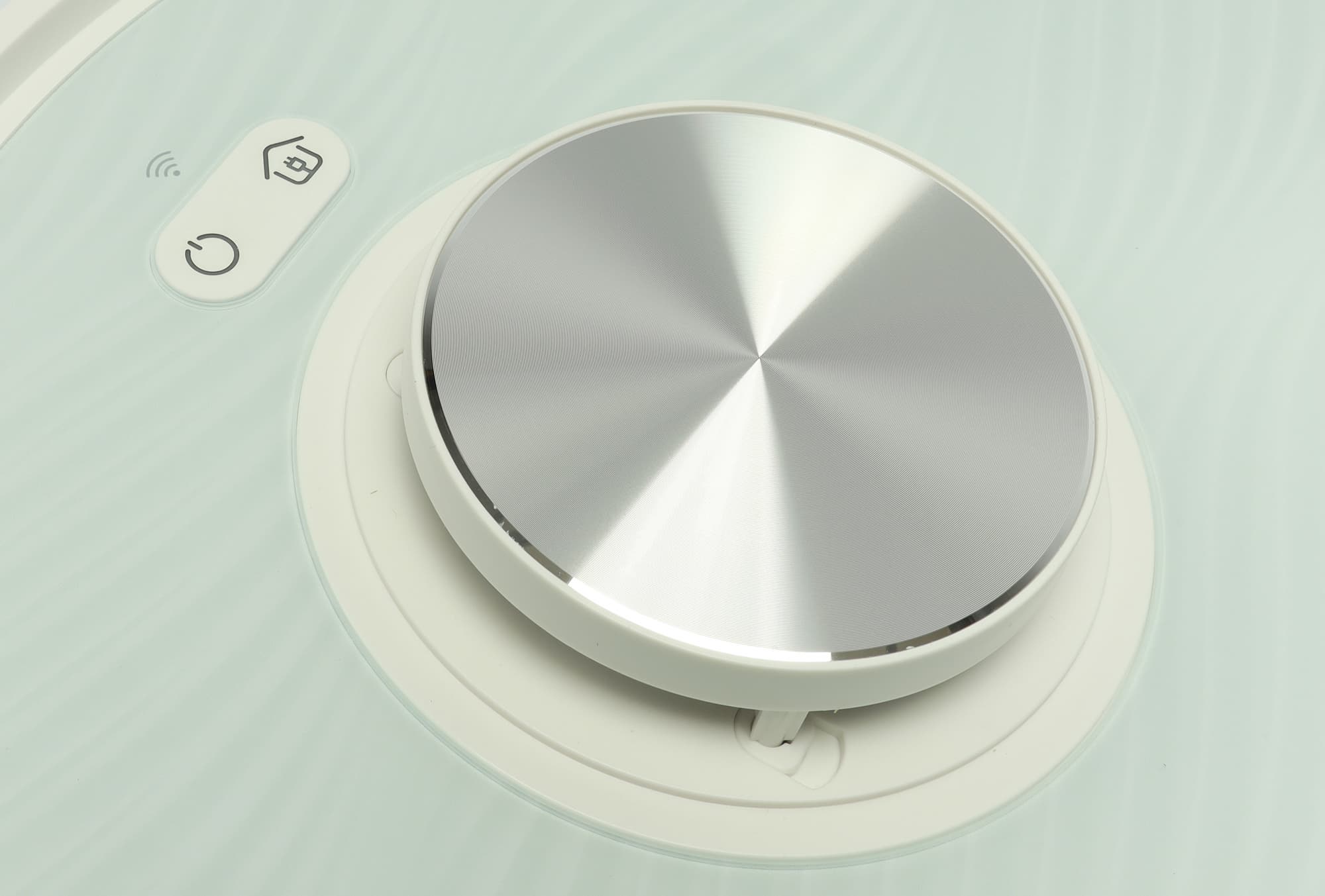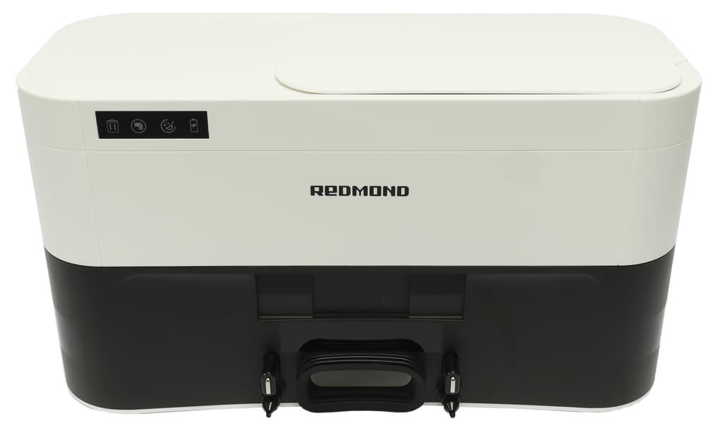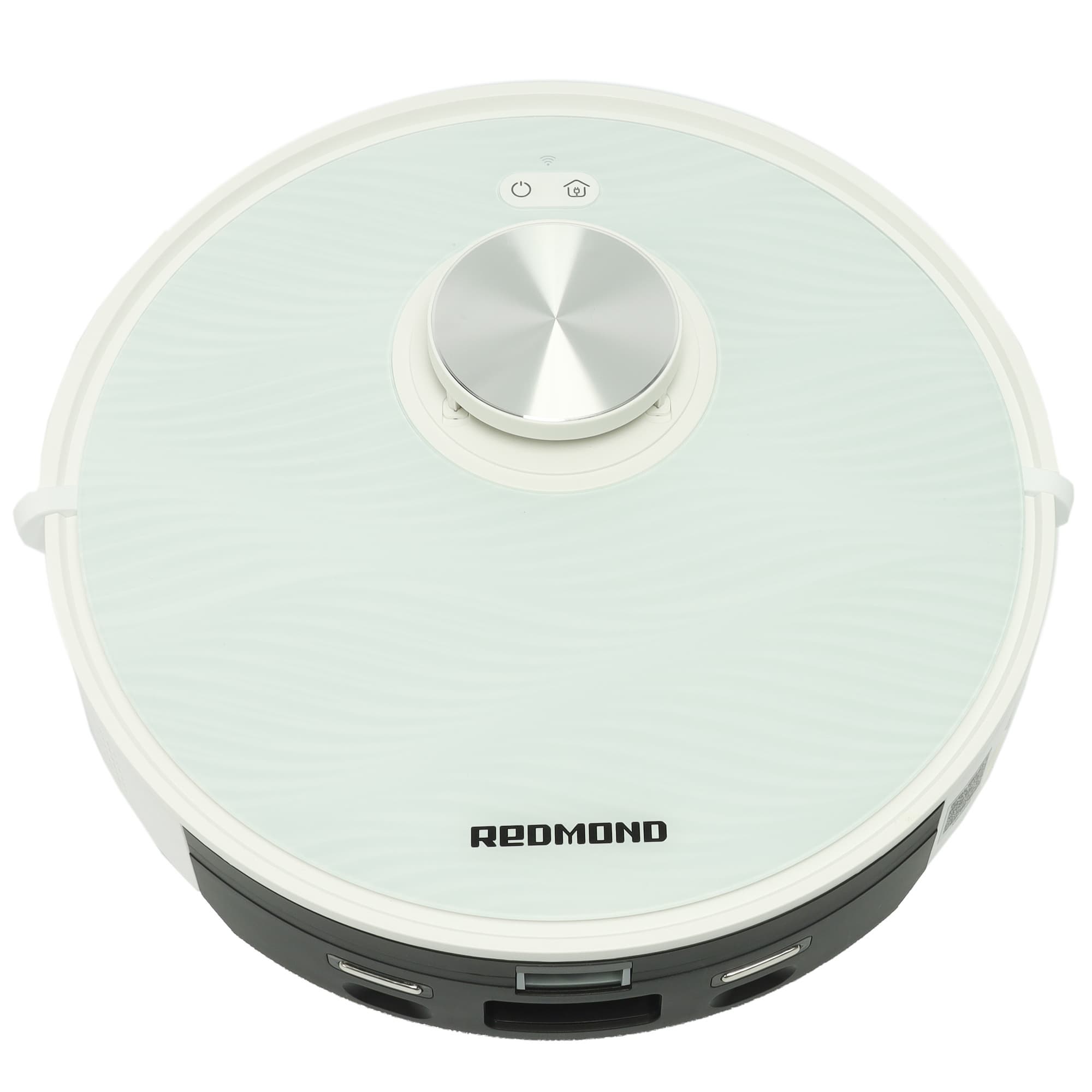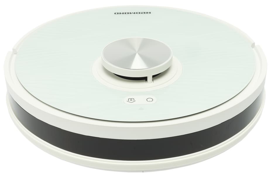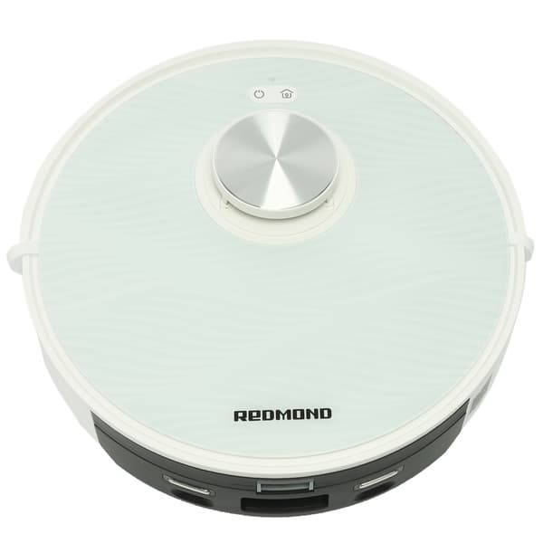 На верхней панели робота расположены две кнопки, с помощью которых можно запустить уборку либо отправить робота на базу для подзарядки. Рядом с ними находится индикатор подключения к сети Wi-Fi. По центру возвышается башенка лидара, а под ней нанесен логотип Redmond.
