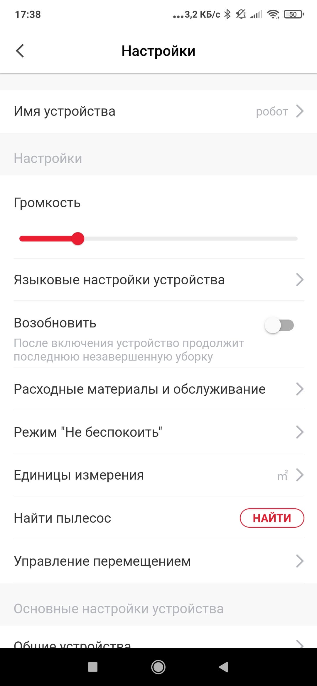 Обращаем внимание на наличие режима «не беспокоить», также можем настроить уборку по расписанию, начать управлять роботом вручную, включить режим возобновления уборки в случае разряда аккумулятора... вот, пожалуй, и все. Опций не слишком много...