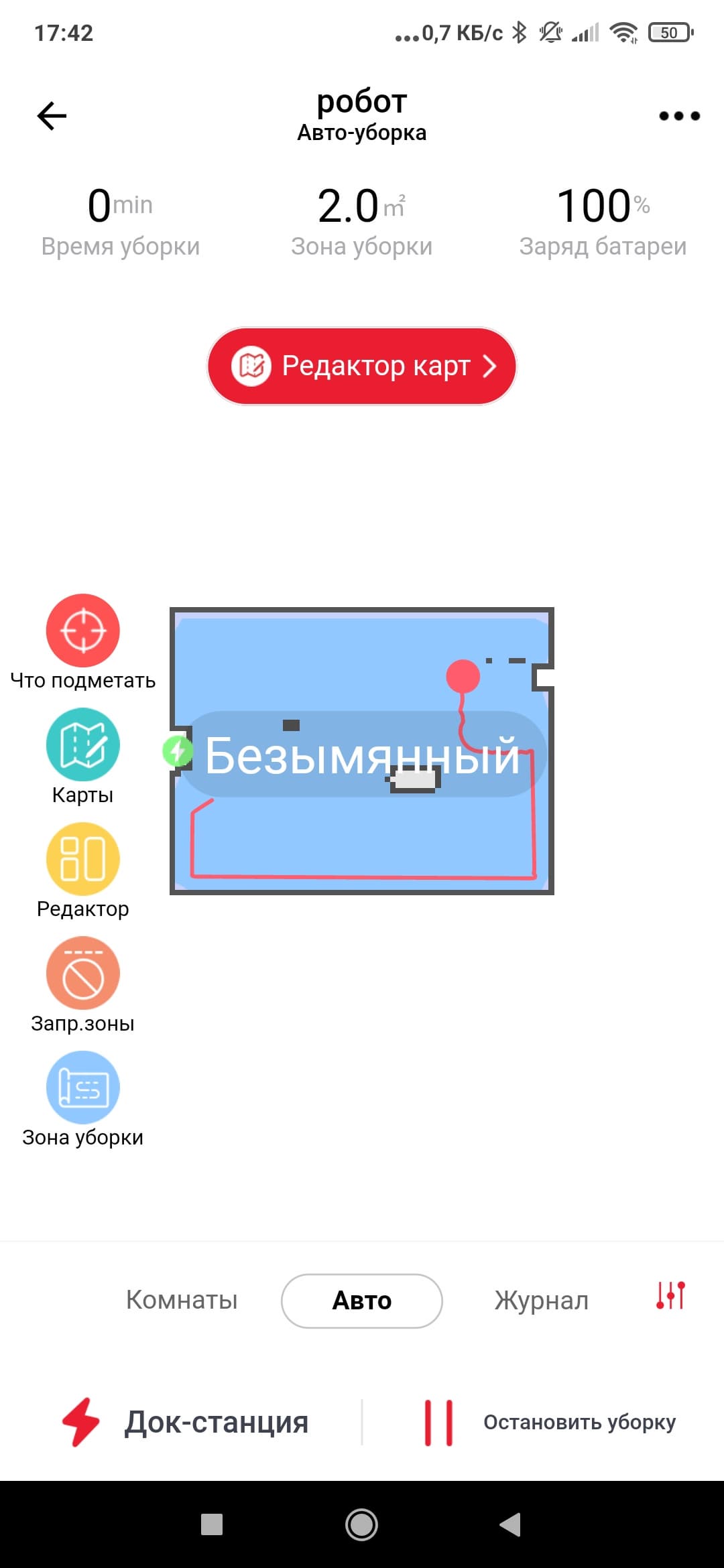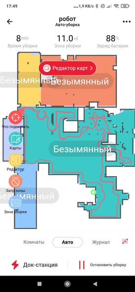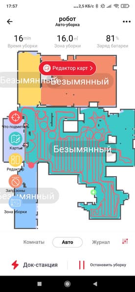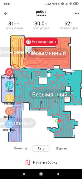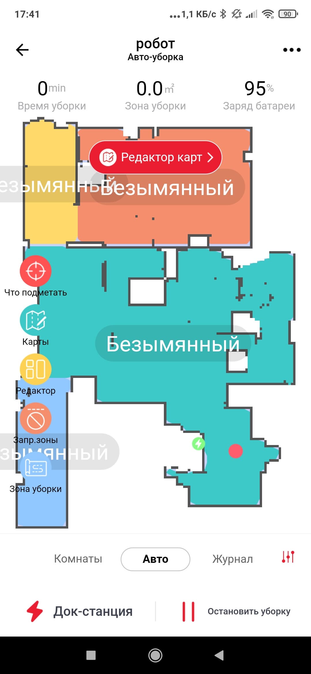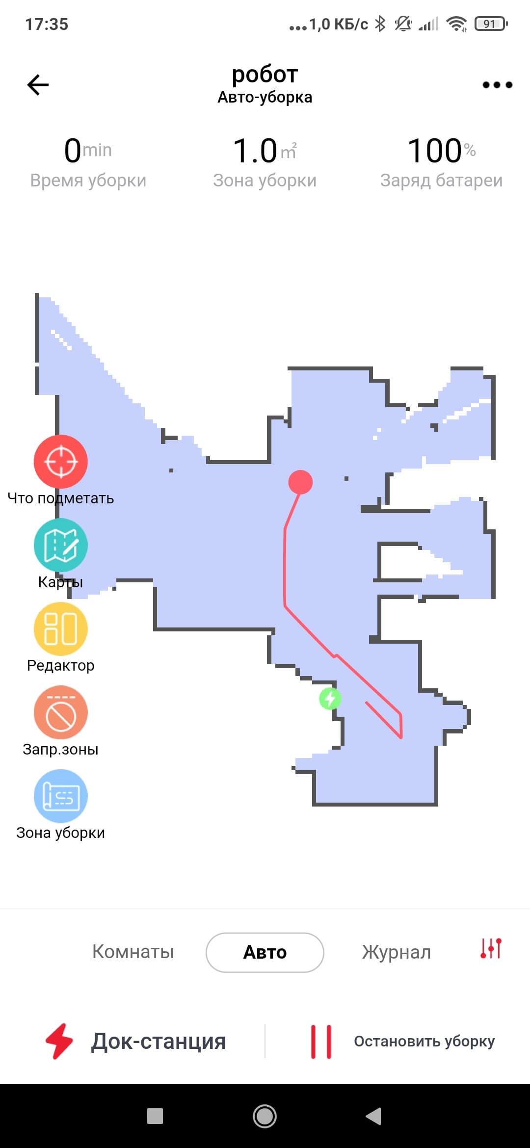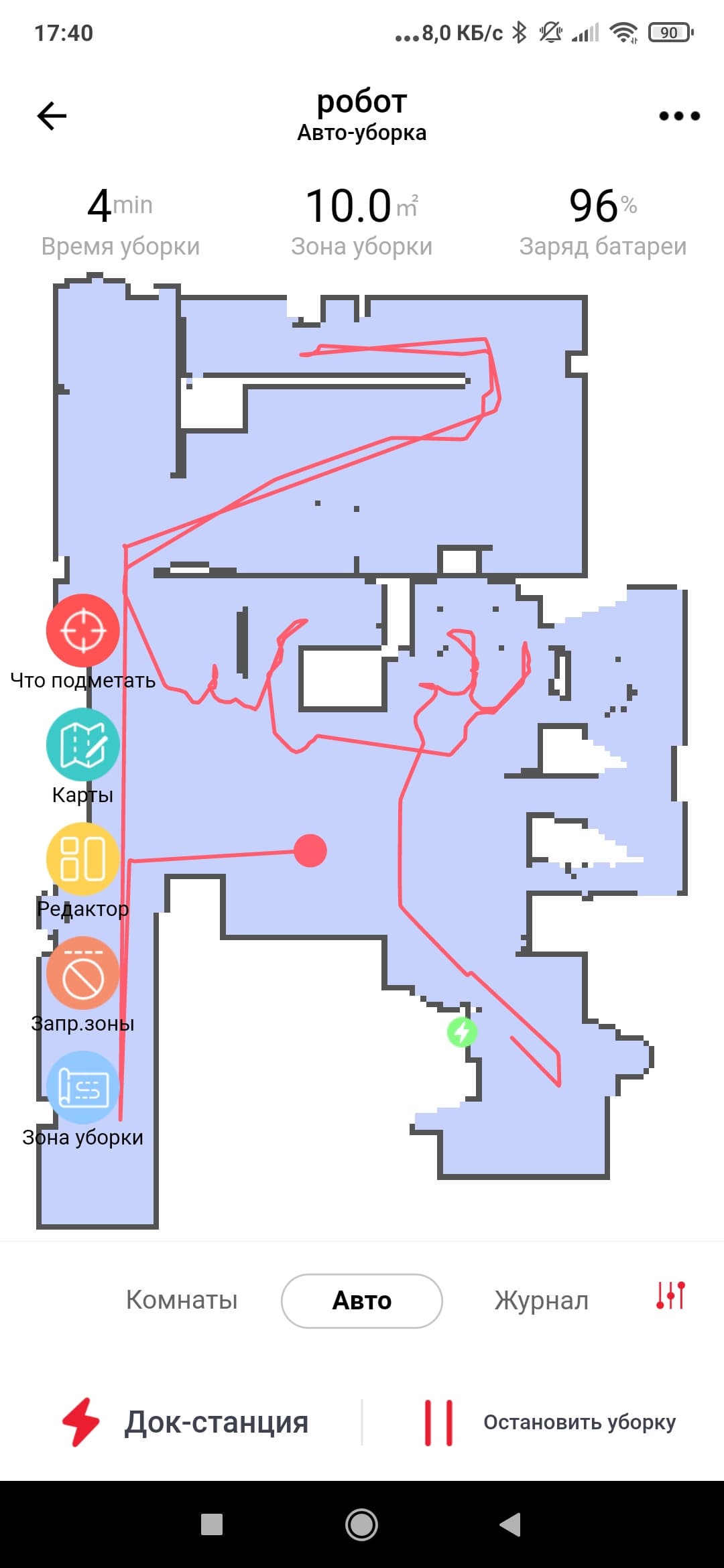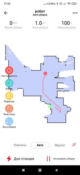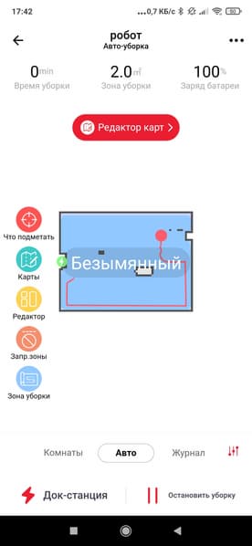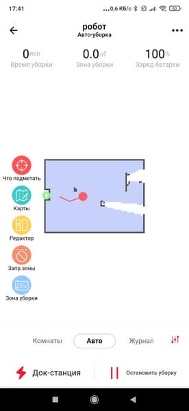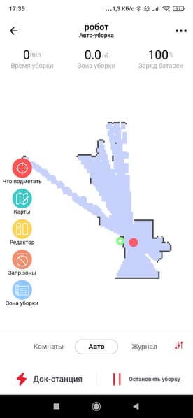 В нижней части находятся кнопки «Комната» (уборка в отмеченных помещениях), «Авто» — автоматическая уборка, «Журнал» — просмотр истории уборок. Во время уборки вместо них появляются кнопки «док-станция» (возврат на базу) и «Остановить уборку».