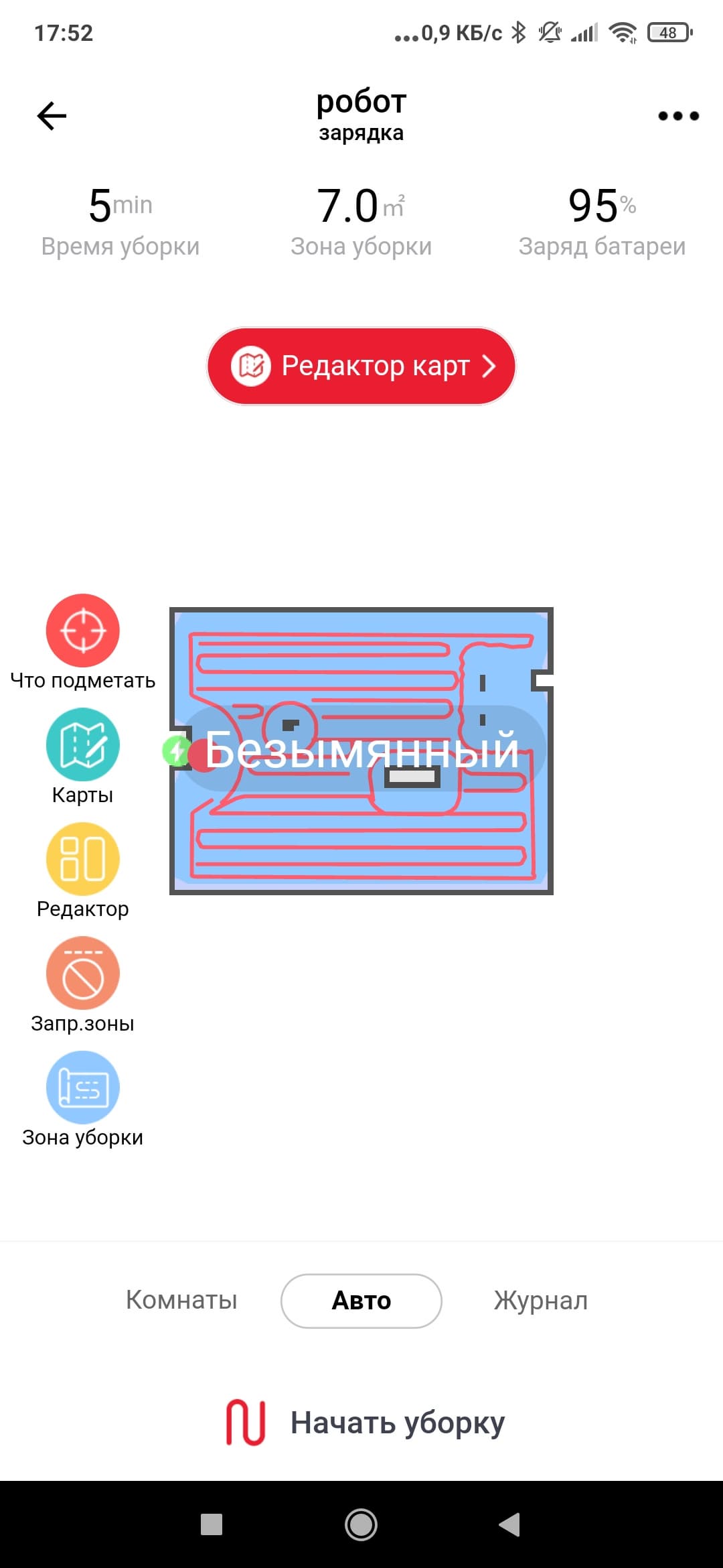 Карта будет строиться и отображаться на экране смартфона непосредственно в процессе первой уборки. Как и ожидалось, соответствие карты и реального помещения у данной модели отличное. Благодаря датчику-лидару робот уверенно определяет всевозможные помехи и границы помещения, в результате чего карта получается точная и подробная. «Не видит» робот разве что низкие препятствия.