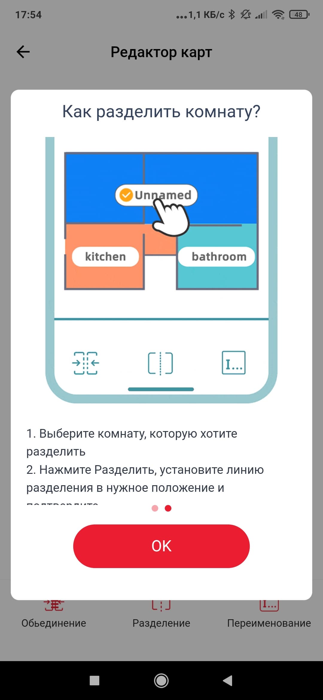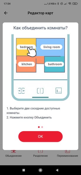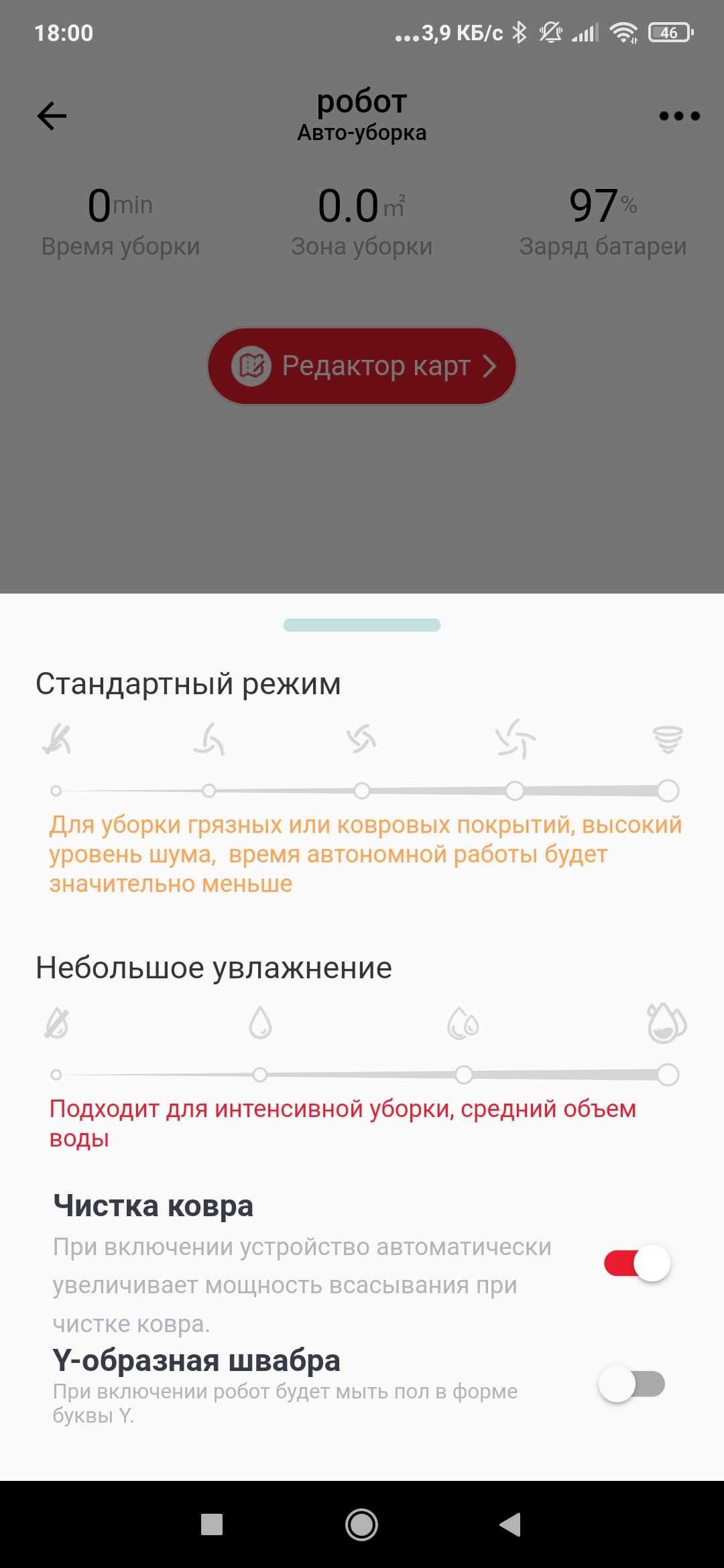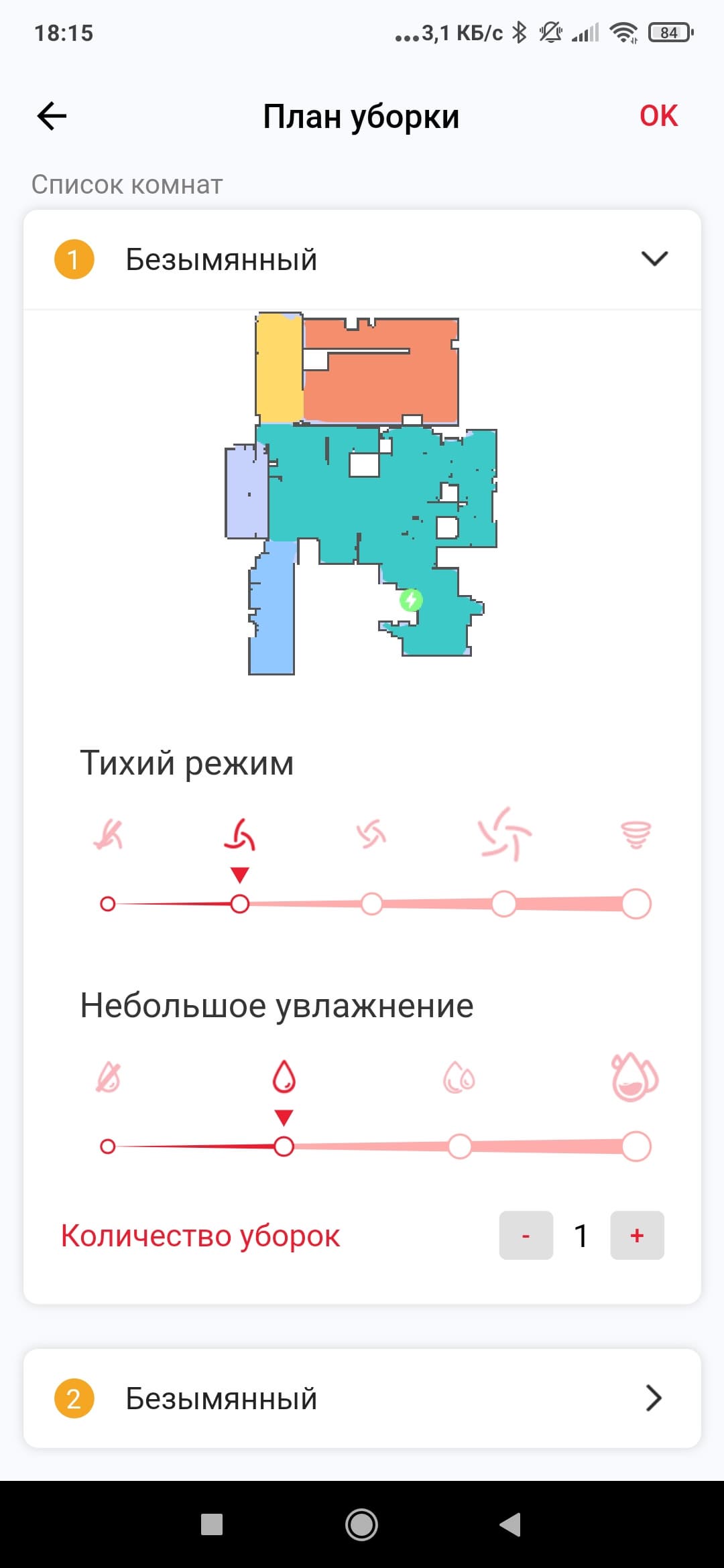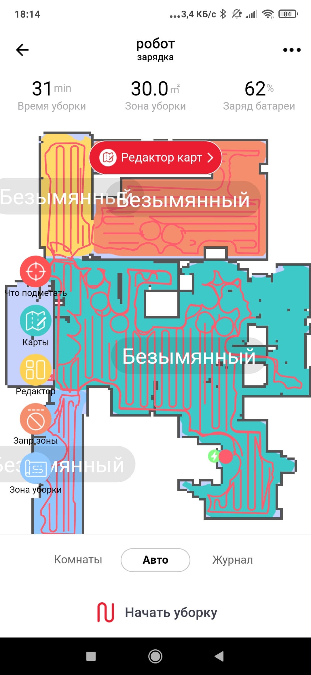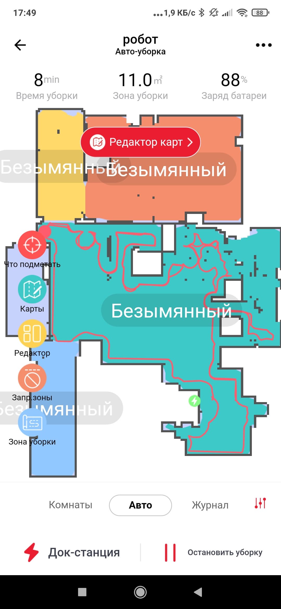 Робот запоминает карты и позволяет их редактировать — в том числе объединять и разделять помещения, устанавливать виртуальные стены и запретные зоны. Для каждой комнаты можно установить уровень подачи воды, включить режим «только влажная уборка». Поддерживается работа с несколькими картами, что пригодится владельцам двухэтажных домов.
