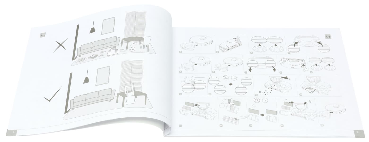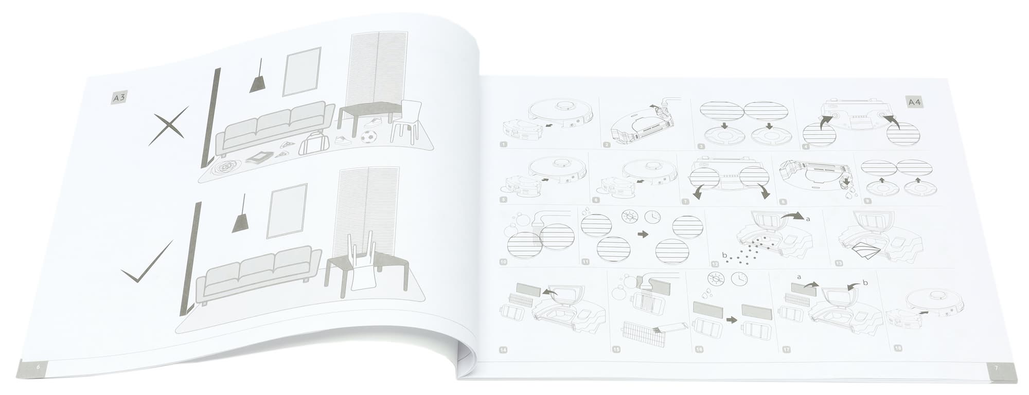 Руководство пользователя представляет собой брошюру формата А5, изданную на плотной глянцевой бумаге с традиционно для Redmond прекрасным качеством полиграфии. Первые 11 страниц документа занимают схемы и рисунки, подробно разъясняющие конструкцию робота, его эксплуатацию и уход за ним.