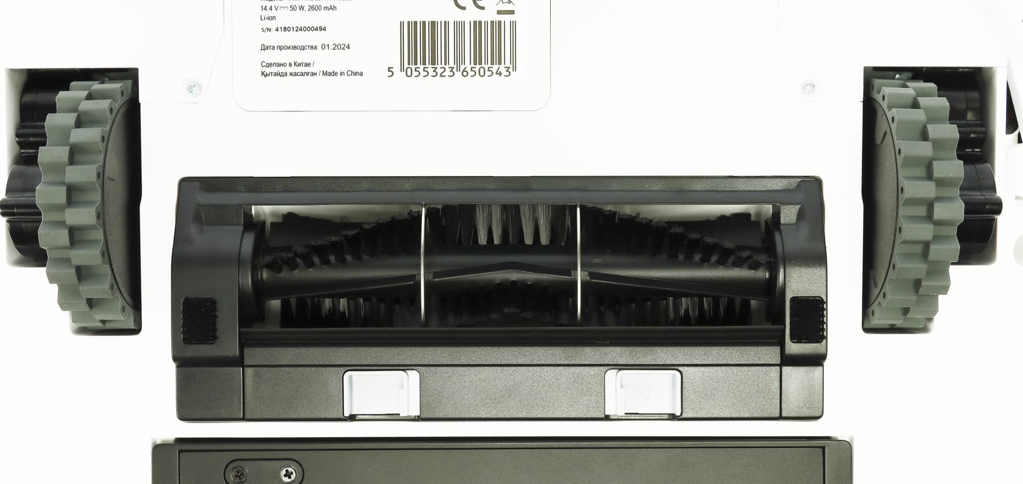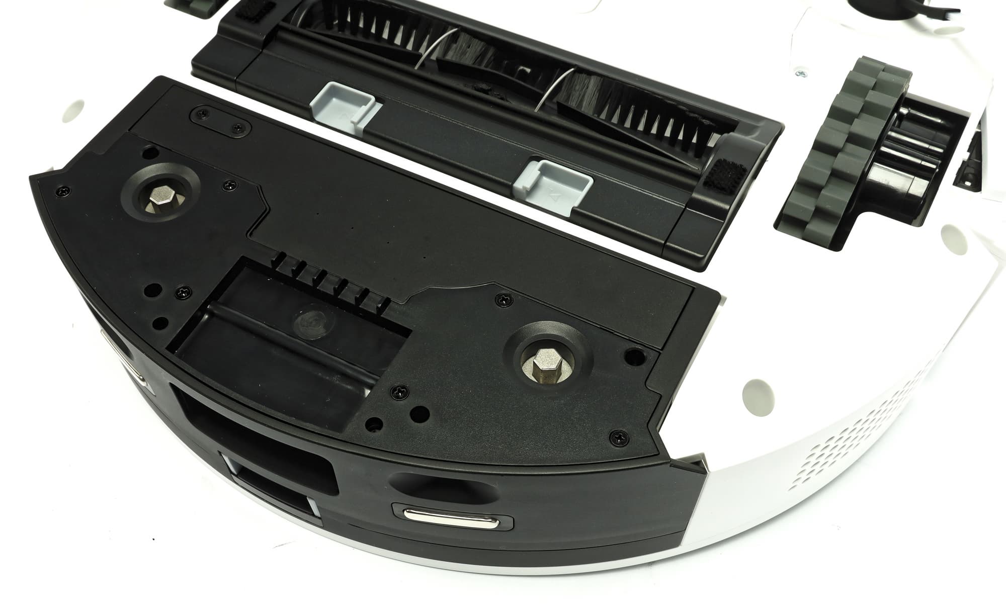 Перевернув робота, мы видим традиционную компоновку: два ведущих колеса по бокам, круглый направляющий ролик и две боковые щетки.