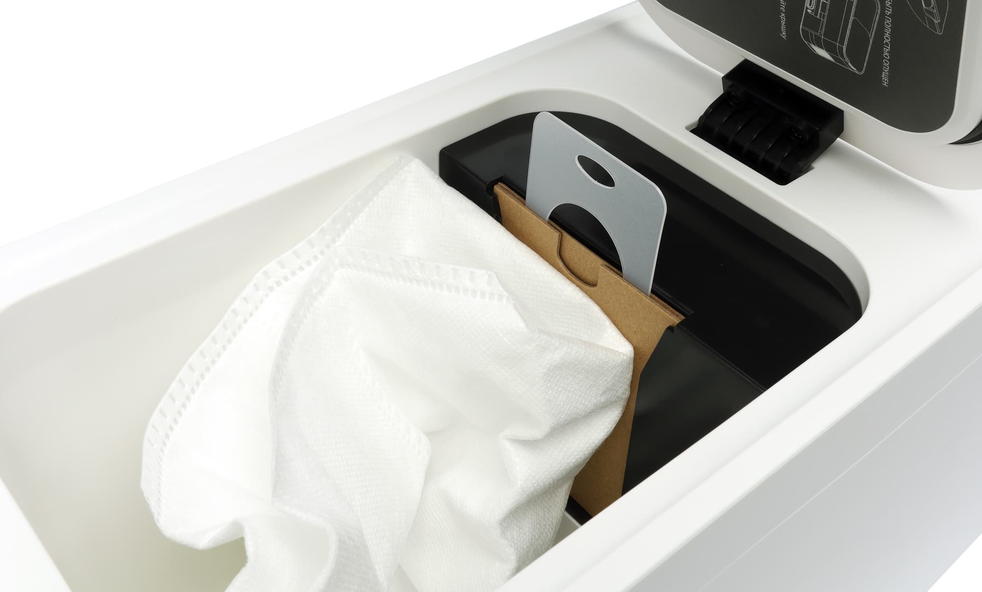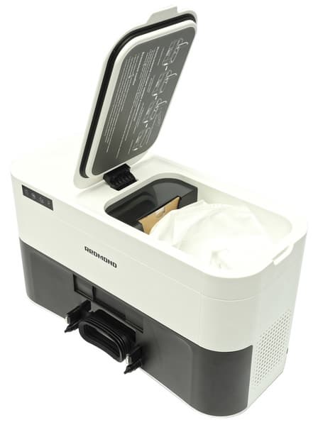 Пакет для мусора устанавливается под откидной верхней крышкой.