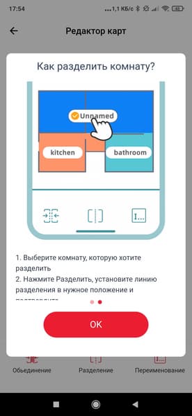 В левой части главного экрана находятся кнопки редактирования карты, а также кнопки для выбора зон уборки. В приложении присутствуют подсказки, поясняющие как правильно выполнить ту или иную операцию с картой.