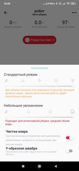 Иконка с переключателями позволяет задать уровень всасывания, степень увлажнения швабры, режим усиленной уборки на коврах, а также режим мытья пола по Y-образному паттерну.