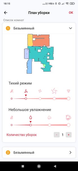 А вот в режиме редактирования карты есть еще несколько интересных возможностей. Тут мы можем задать собственные настройки для каждого помещения — выбрать подходящий уровень всасывания, степень увлажнения, а также установить количество уборок в той или иной комнате. Это, несомненно, окажется полезным для того, чтобы, например получше отмыть кухню или зону, где отдыхают домашние животные.