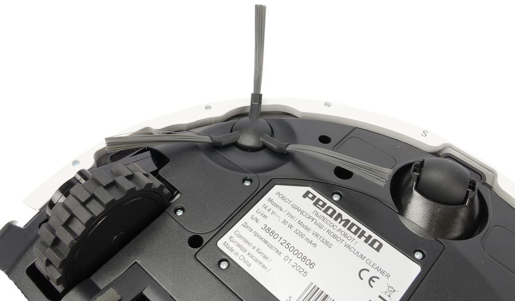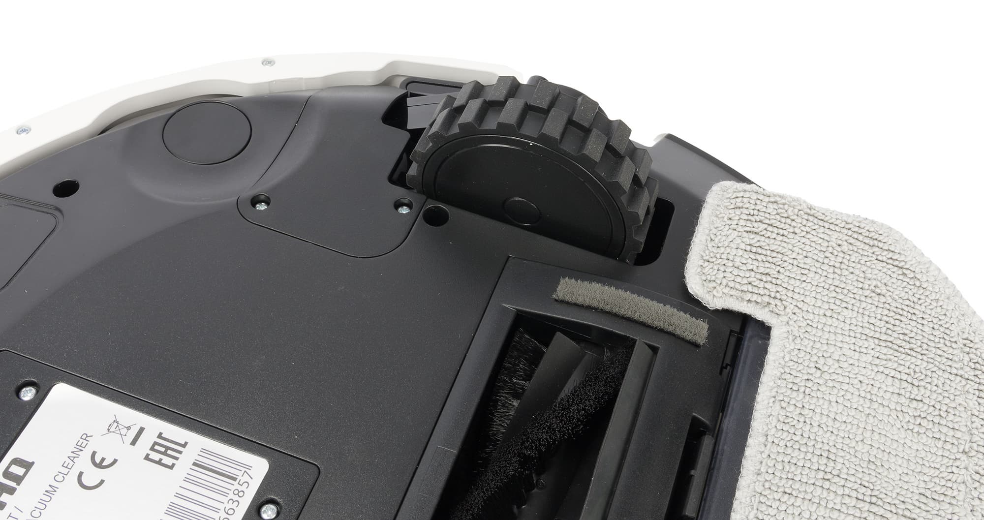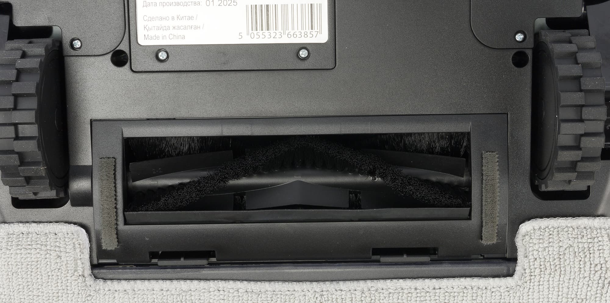 Перевернув прибор, мы видим традиционную компоновку: два ведущих колеса по бокам, круглый направляющий ролик и боковую щетку.