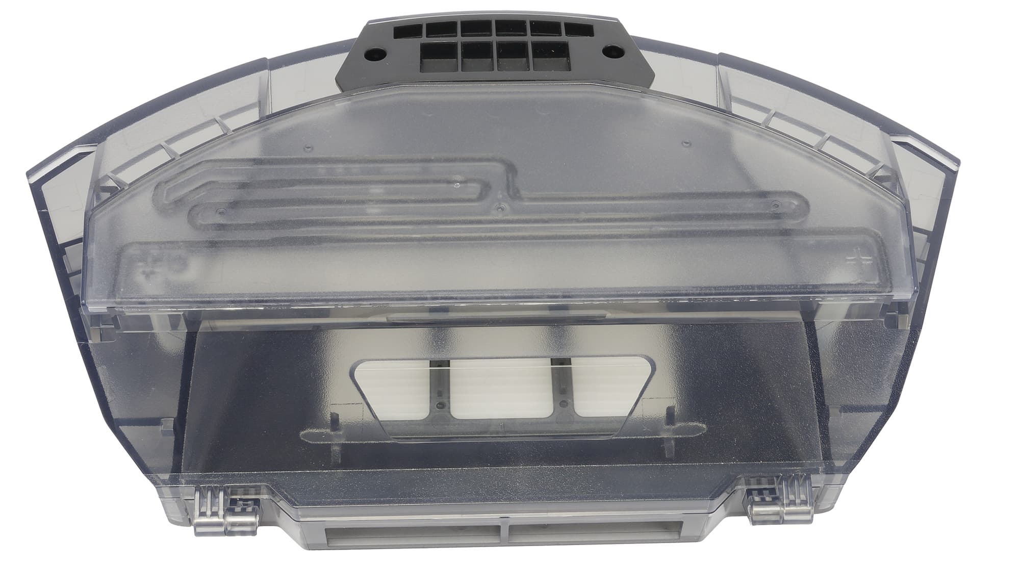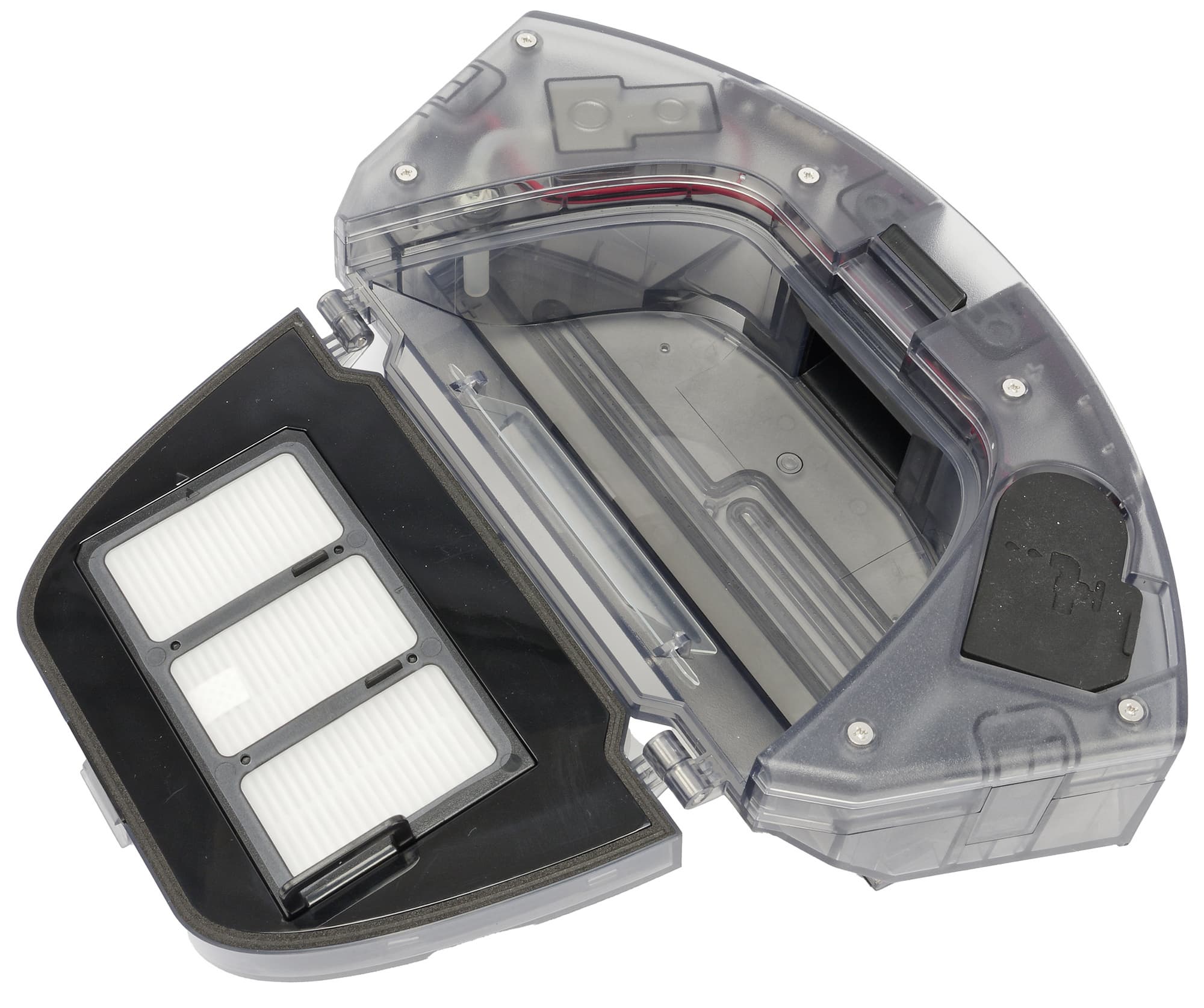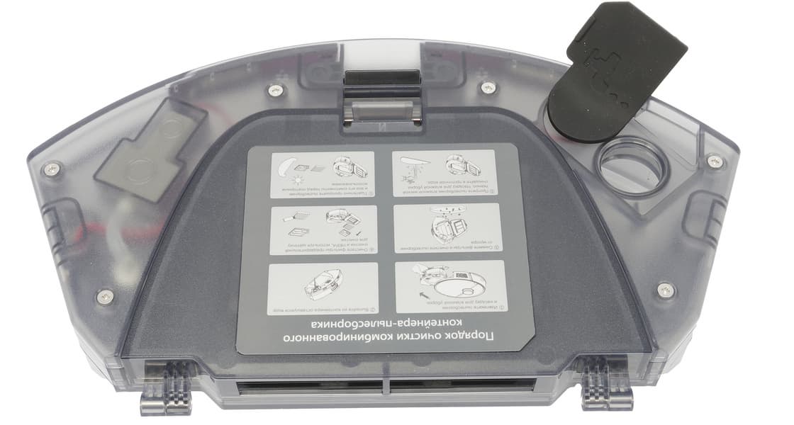 В задней части устройства расположен комбинированный модуль для сбора мусора и влажной уборки. Он, как водится, фиксируется на своем месте с помощью кнопки-защелки.