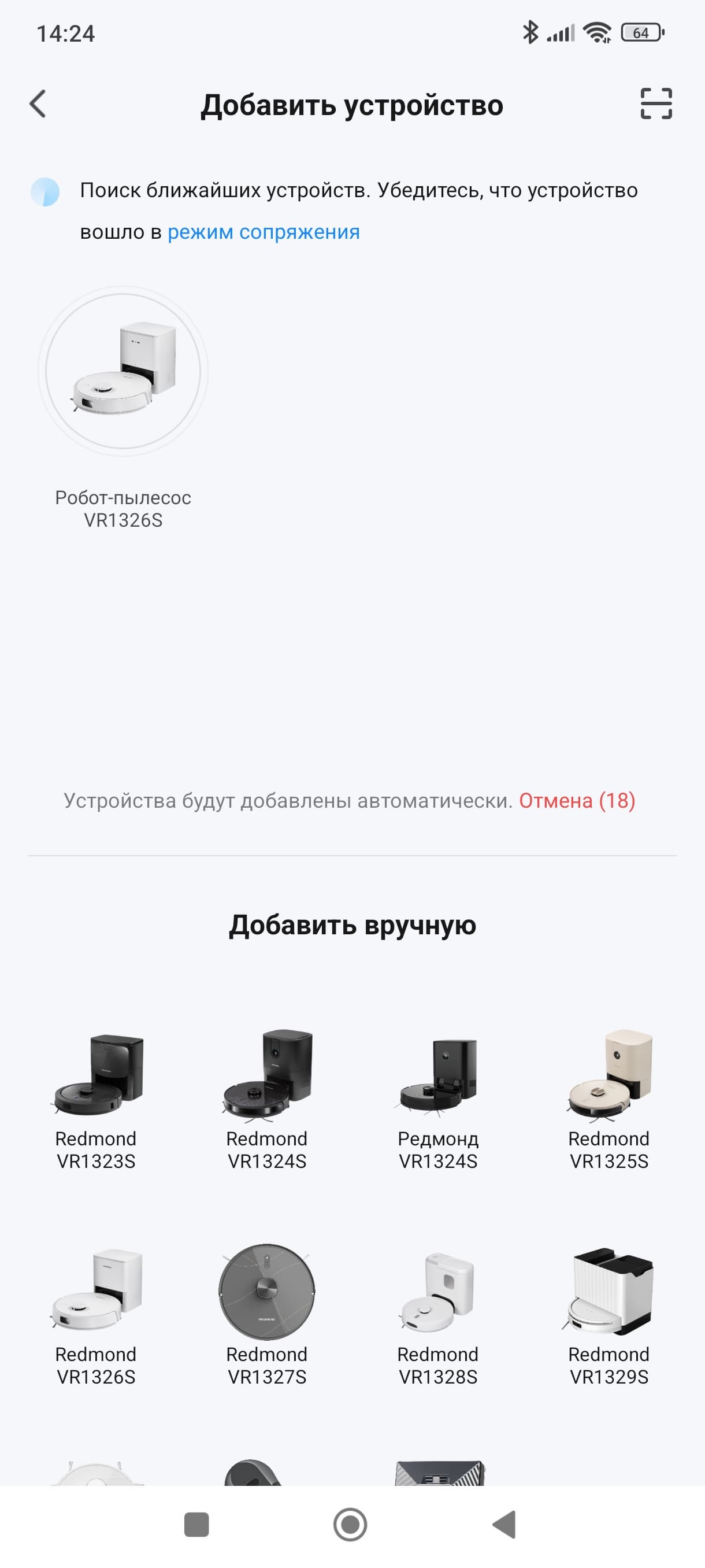 Для добавления пылесоса нужно перевести его в режим сопряжения, либо добавить устройство вручную., выбрав его из списка моделей. Затем — сообщить приложению название беспроводной сети (Wi-Fi, 2,4 ГГц) и пароль от нее. Режим подключения к смартфону активируется длинным нажатием на кнопку на корпусе устройства. Процесс длится не больше пары минут и завершается без затруднений.