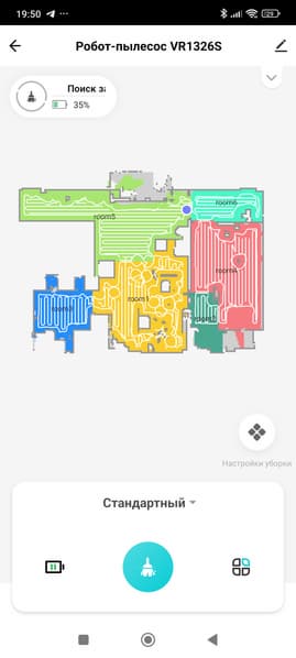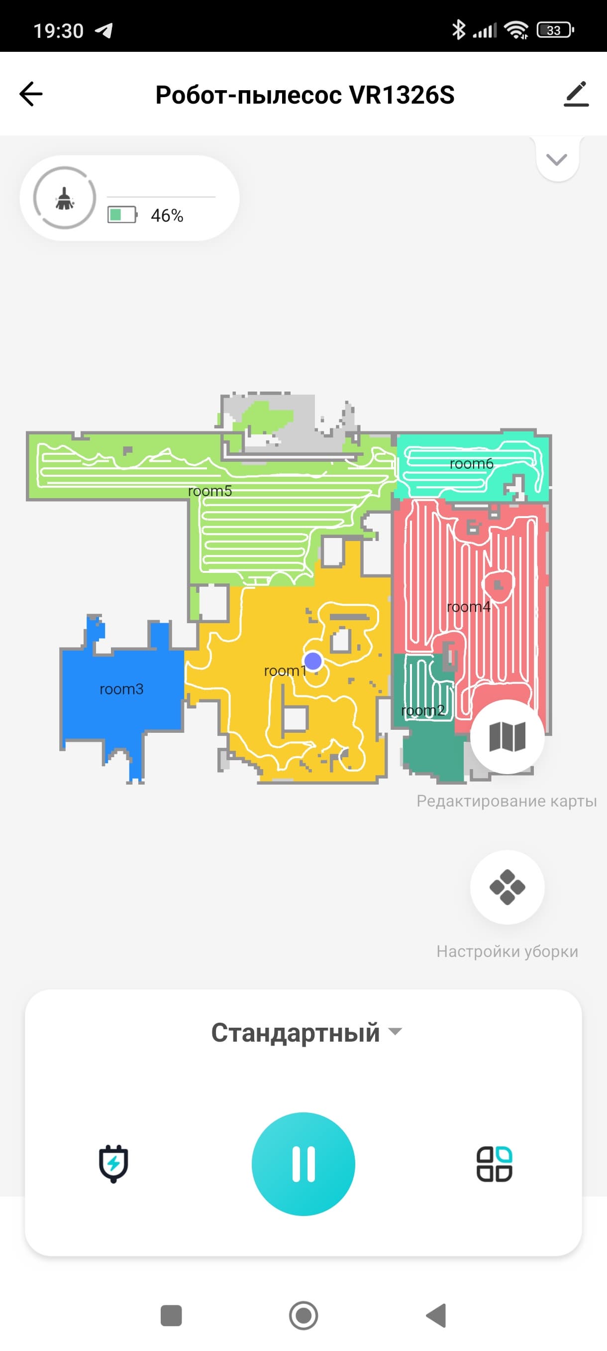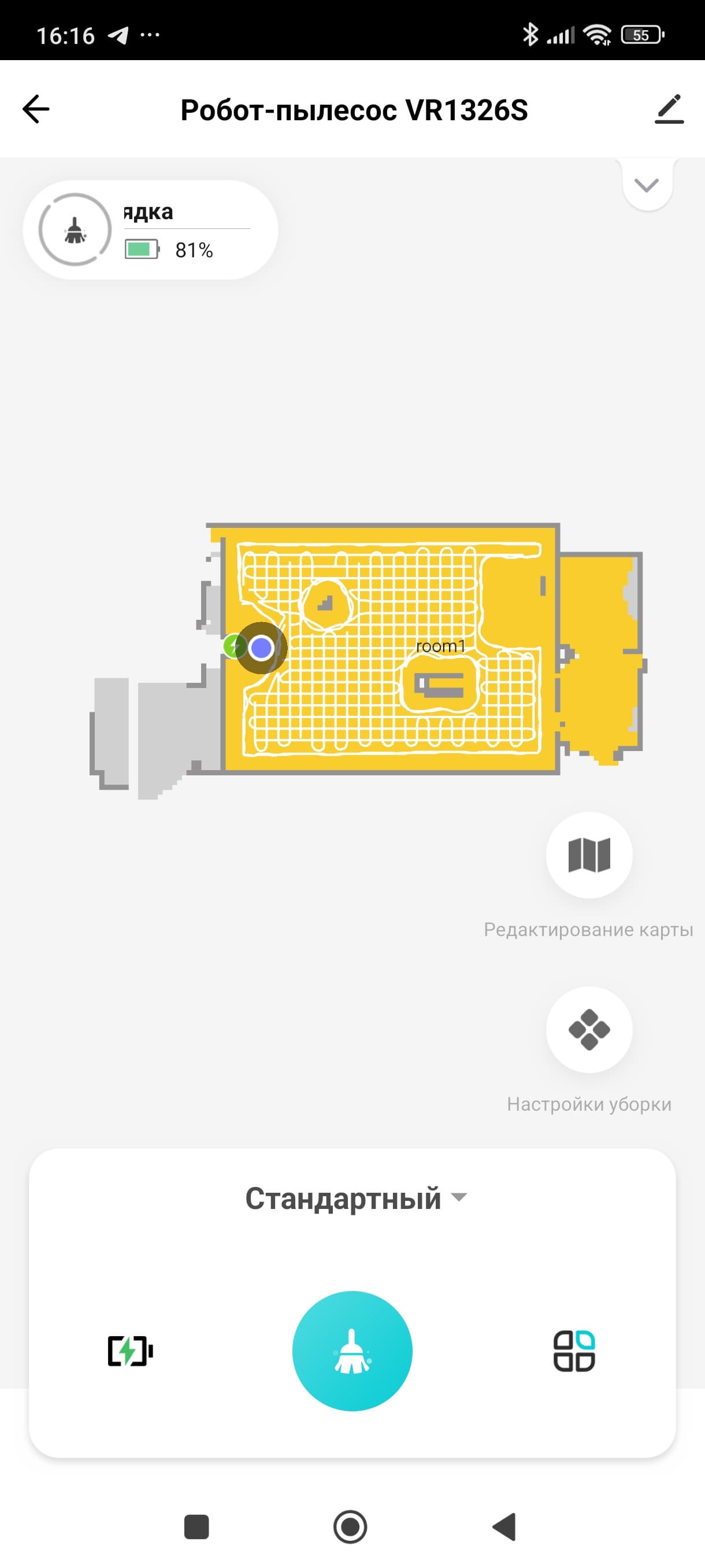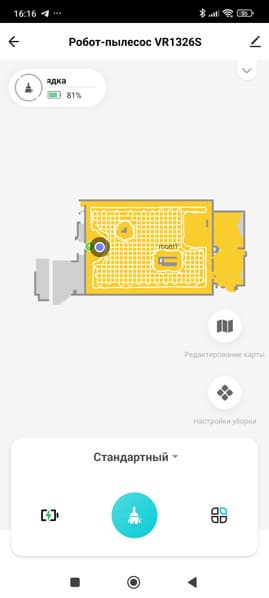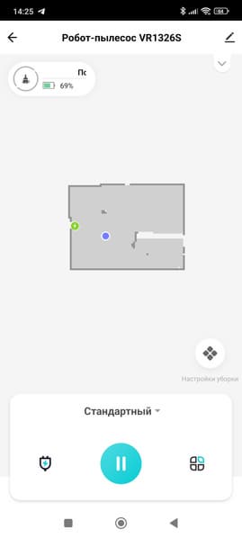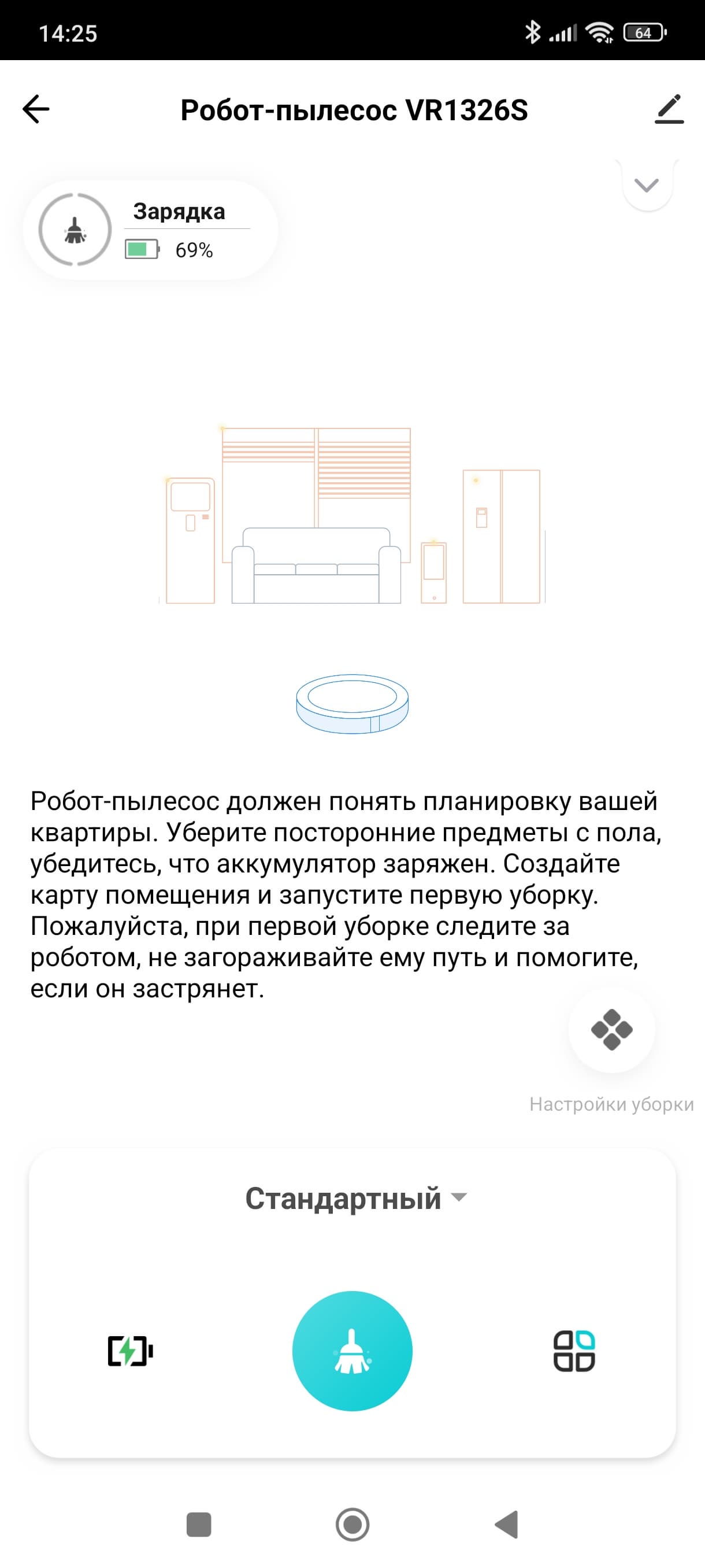На главном экране отображаются карта помещения, время текущей или последней уборки, обработанная площадь и заряд батареи.