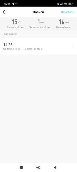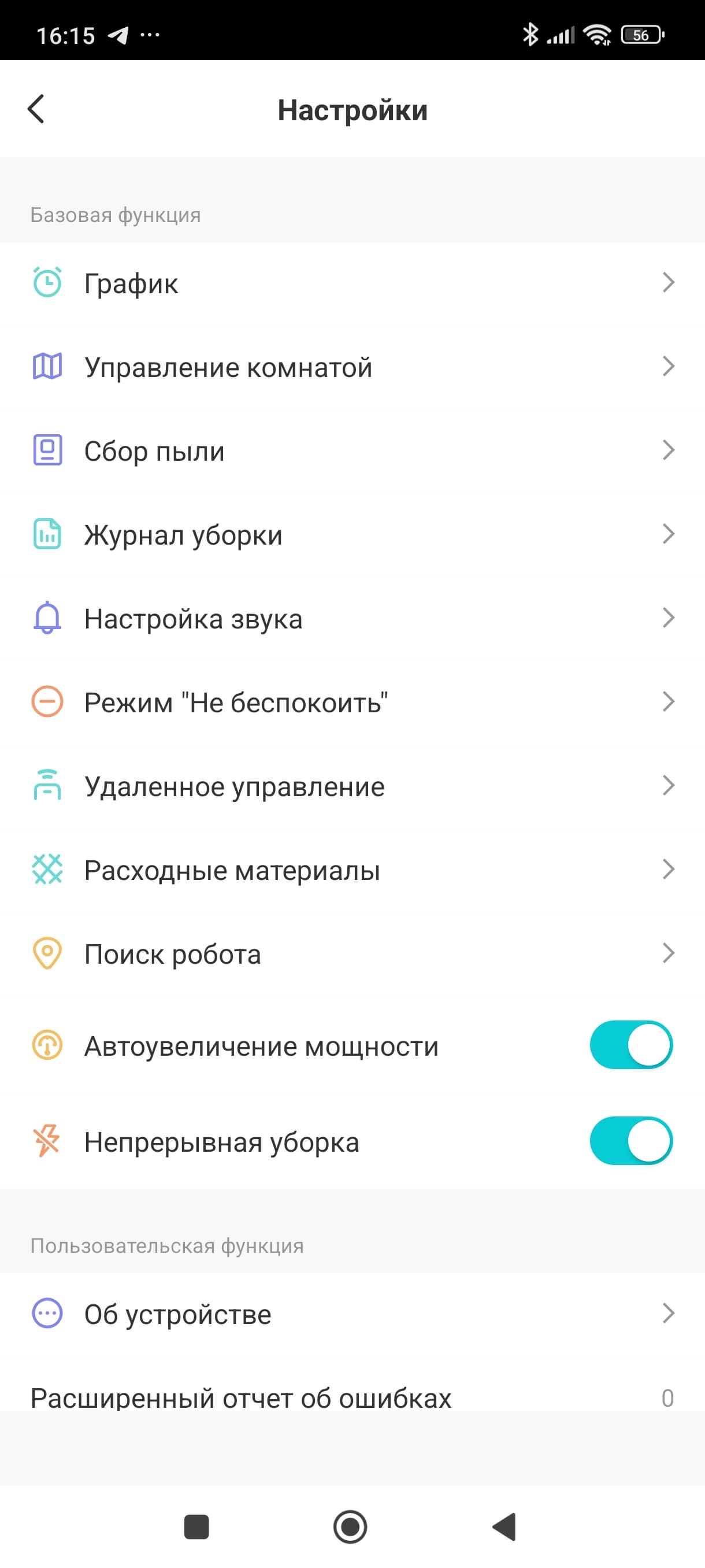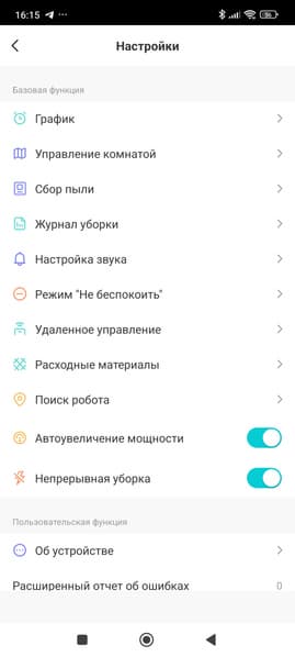 Тут мы можем настроить уборку по расписанию, начать управлять роботом вручную, отредактировать карту, просмотреть историю уборок с указанием времени начала работы и ее продолжительности, настроить режим «Не беспокоить» (в заданное время, обычно — ночью) и т. п. Также можно включить режим «Продолжить уборку после зарядки», что позволит роботу подзарядиться и взяться за дело с новыми силами — с того самого места, где он приостановил выполнение программы.