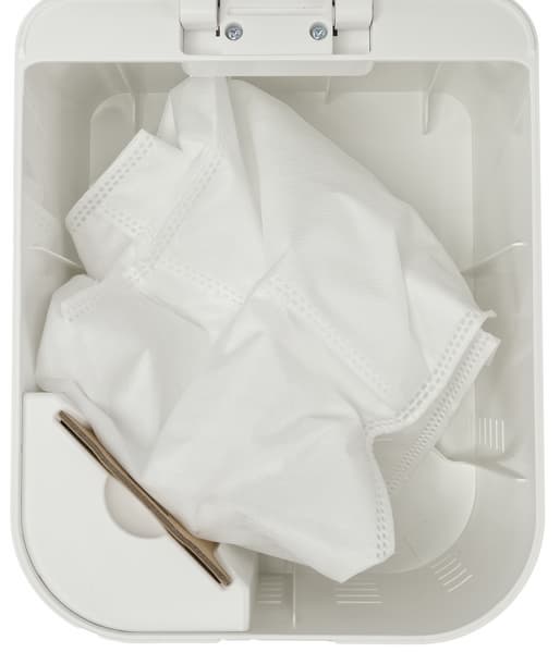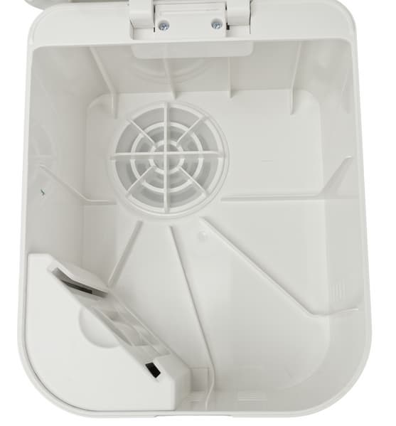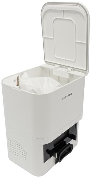 Пакет для мусора устанавливается под откидной верхней крышкой.