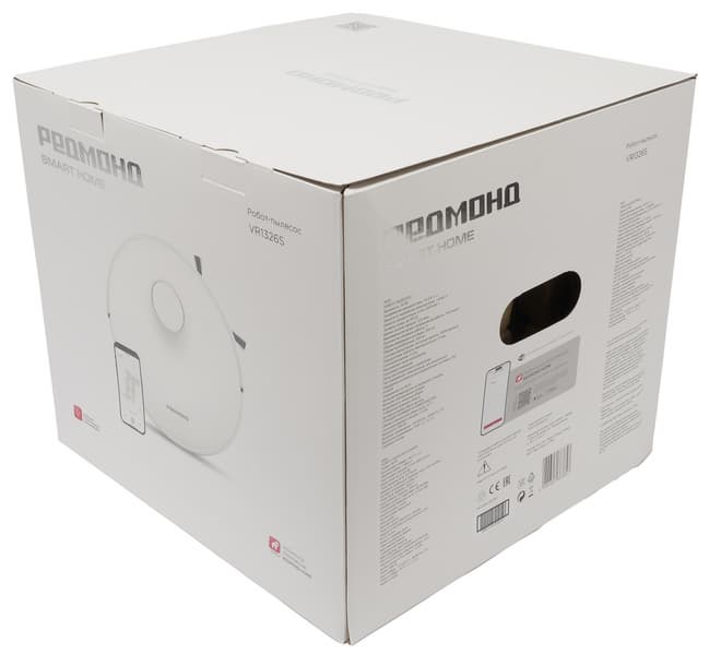 Картонная коробка-кубик, в которой поставляется робот-пылесос, оказалась вполне обычной как по габаритам, так и по оформлению. На белом фоне мы видим полноцветные фотографии устройства, описание ключевых особенностей робота, а также изображение смартфона, что недвусмысленно намекает нам о том, что устройство поддерживает управление с помощью специального приложения.