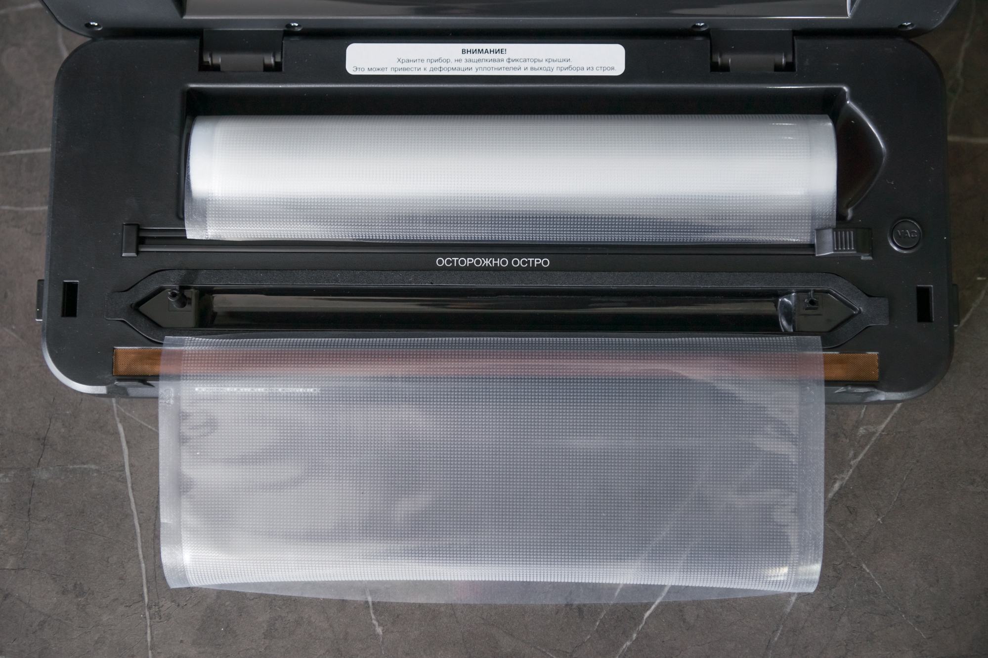 Выше в специальном отсеке размещен комплектный рулон (28×300 см), который можно нарезать на пакеты необходимой длины, не вынимая из корпуса, при помощи встроенного резака.