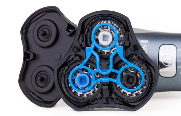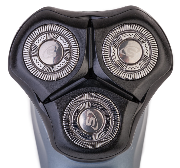 Бреющая головка у этой модели плавающая, ножи — тоже. Правда, конструкция головки такова, что если хотя бы один нож «наклоняется» к центру — все остальные обязаны повторять это движение за ним. То же относится к обратному движению.