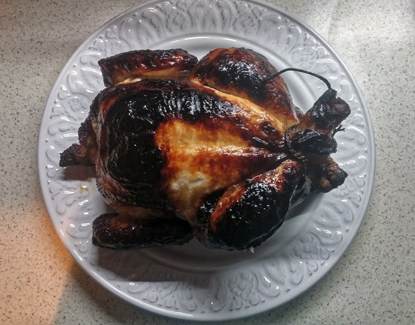 Несмотря на то, что птицу на вертел мы насадили с филигранной точностью, и, вращаясь внутри печки, она не проворачивалась и не провисала, уже через полчаса грудка начала подгорать, тогда как спинка продолжала оставаться бледной. Мы дождались момента, когда курица перевернется спиной к нагревательному элементу и остановили вращение вертела, продолжая поджаривать. Затем мы вновь включили вращение.