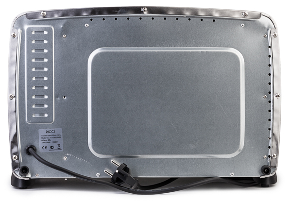 Пластмассовые ножки снизу прибора приподнимают его над поверхностью, не позволяя той нагреваться. Шнур выходит из нижнего левого угла печи, и он довольно короткий — всего 85 см. Это может оказаться критичным при попытке «встроить» прибор в уже оборудованную кухню.