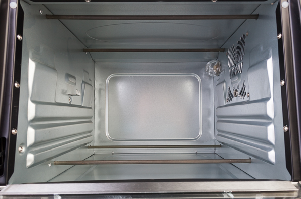 Внутренняя поверхность печи Ricci TO-28CRKSL также изготовлена из нержавеющей стали. Из нее же сделаны и нагревающие элементы, размещенные по два сверху и снизу. С боков мы видим отверстия для крепления вертела и направляющие, на которые ставятся противень и решетка. Все просто, и на вид ничего лишнего.