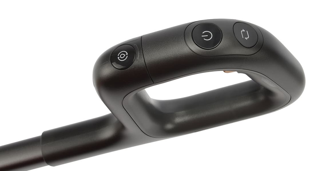 Кнопка «Power» включает устройство и переводит его в спящий режим. В отличие от подавляющего большинства моющих приборов этот при паузе в уборке не отключается полностью, а засыпает. Чтобы продолжить работу, достаточно перевести пылесос из вертикального (парковочного) положения в рабочее. Для полного выключения требуется долгое (3 секунды) нажатие на кнопку.