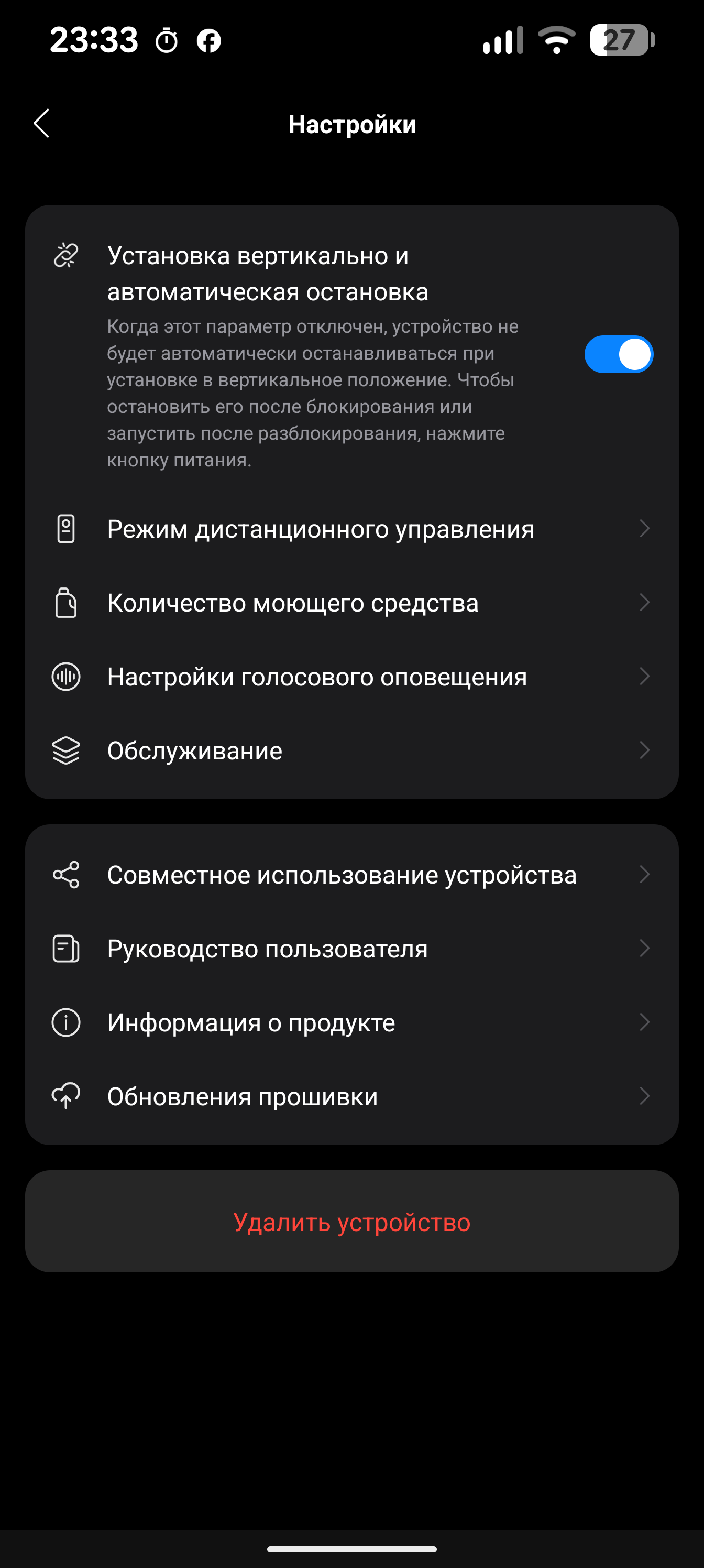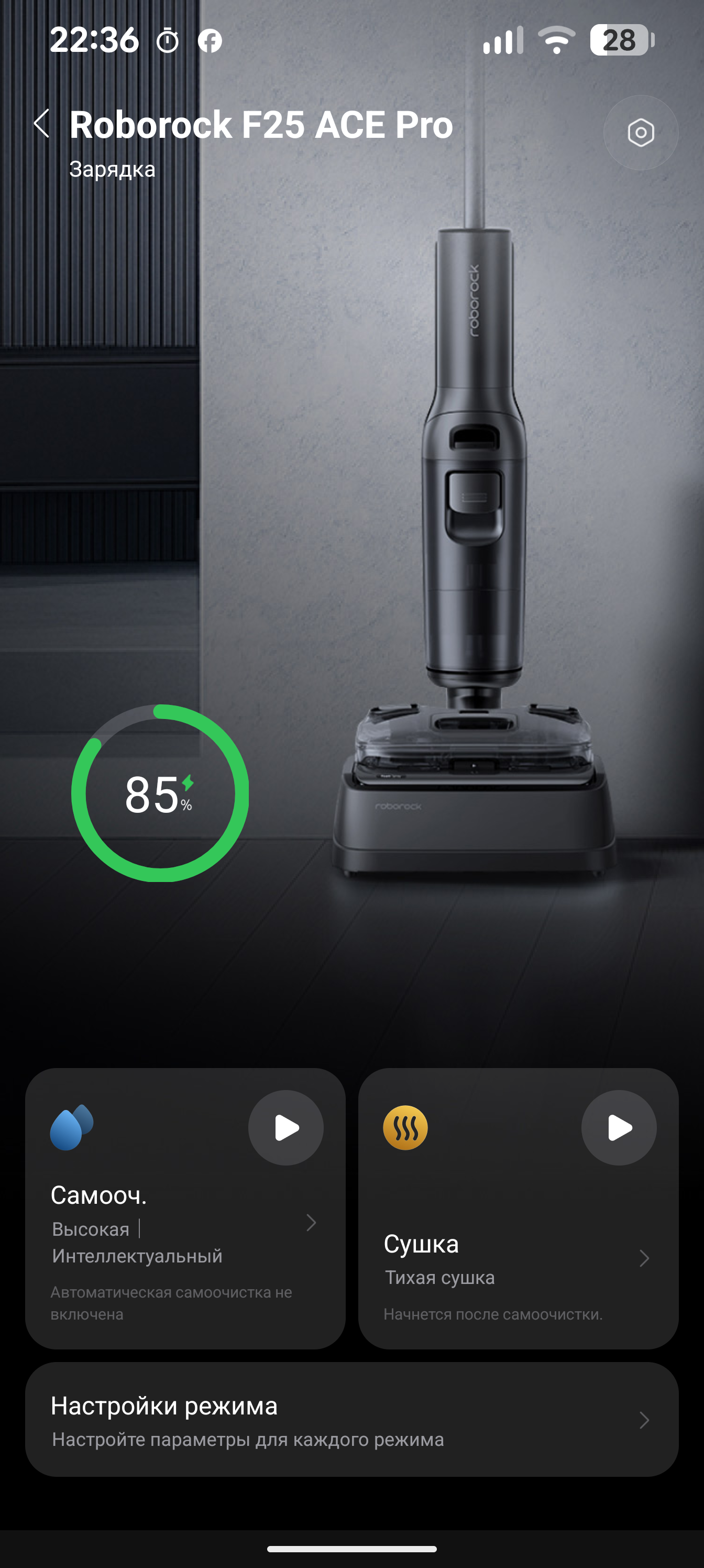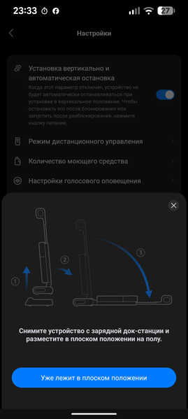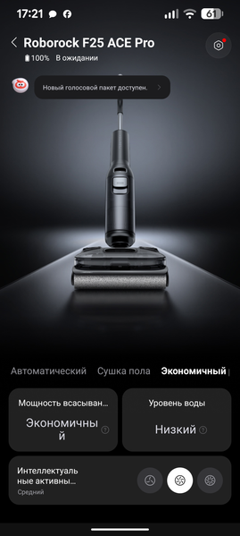 На странице устройства можно увидеть его состояние и уровень заряда аккумулятора. Если пылесос находится на базе, пользователь может запустить самоочистку, настроив интенсивность промывки («сбалансированная», «интеллектуальная» с автоопределением уровня загрязнения и «глубокая») и температуру воды («комнатная» и «высокая»).