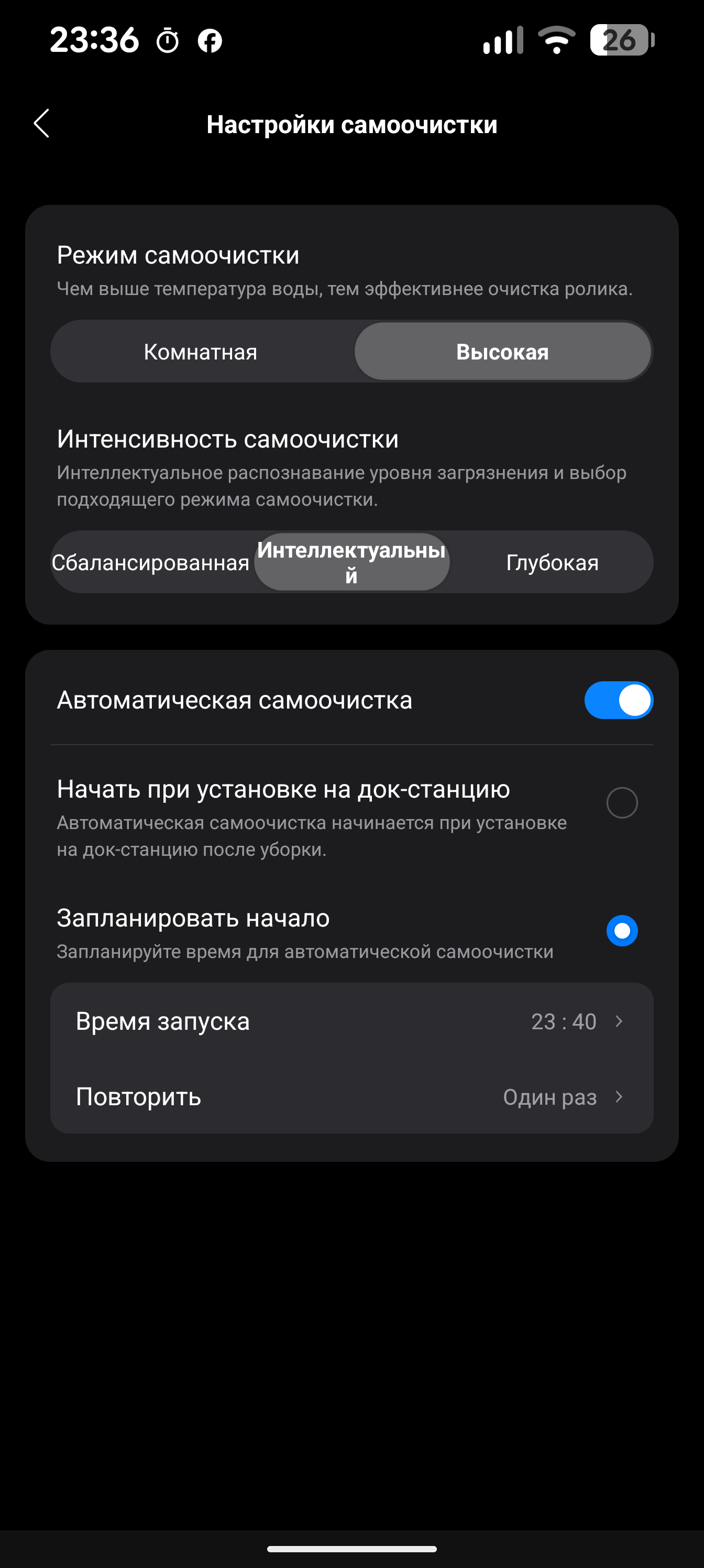 Режим самоочистки может автоматически включаться при возвращении на базу: эту опцию также можно настроить в мобильном приложении. Там же можно установить самоочистку по расписанию — однократно либо ежедневно по времени.
