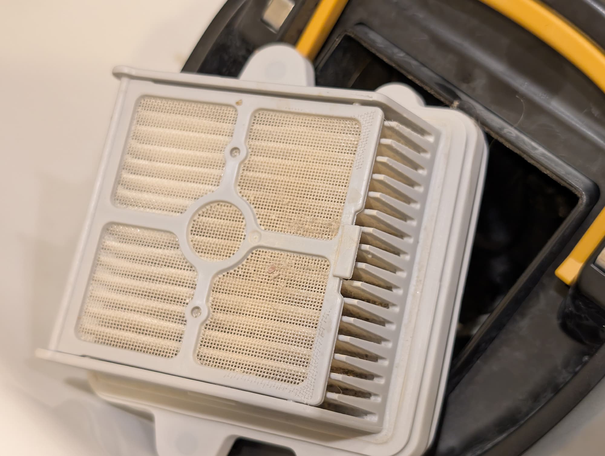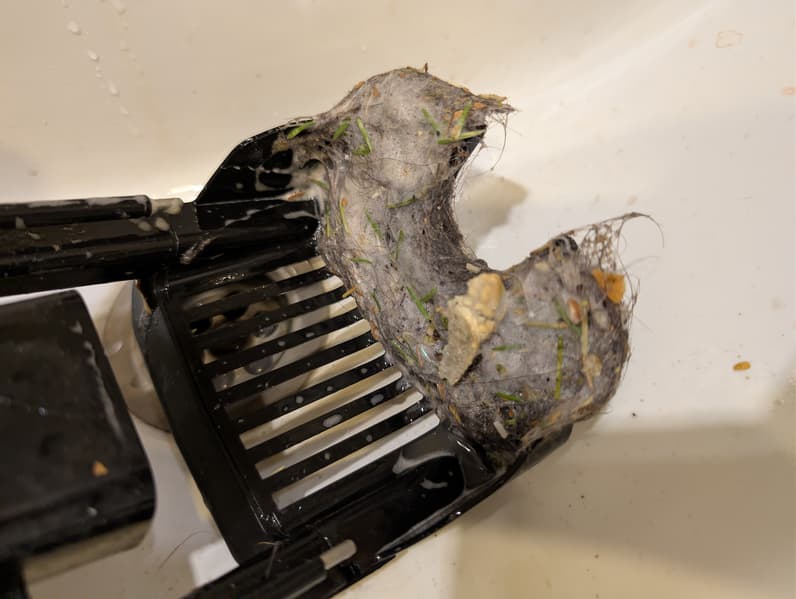 Конструкция мусоросборника оказалась весьма удачной: крупный мусор, который может засорить канализацию, остается на пластиковой решетке. Благодаря изогнутому воздушному тракту до фильтра тонкой очистки долетает очень небольшое количество загрязнений: мыть его придется нечасто.