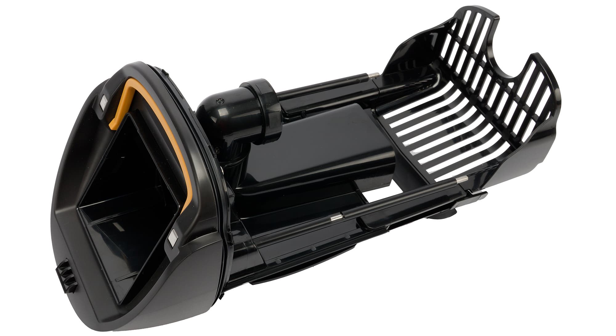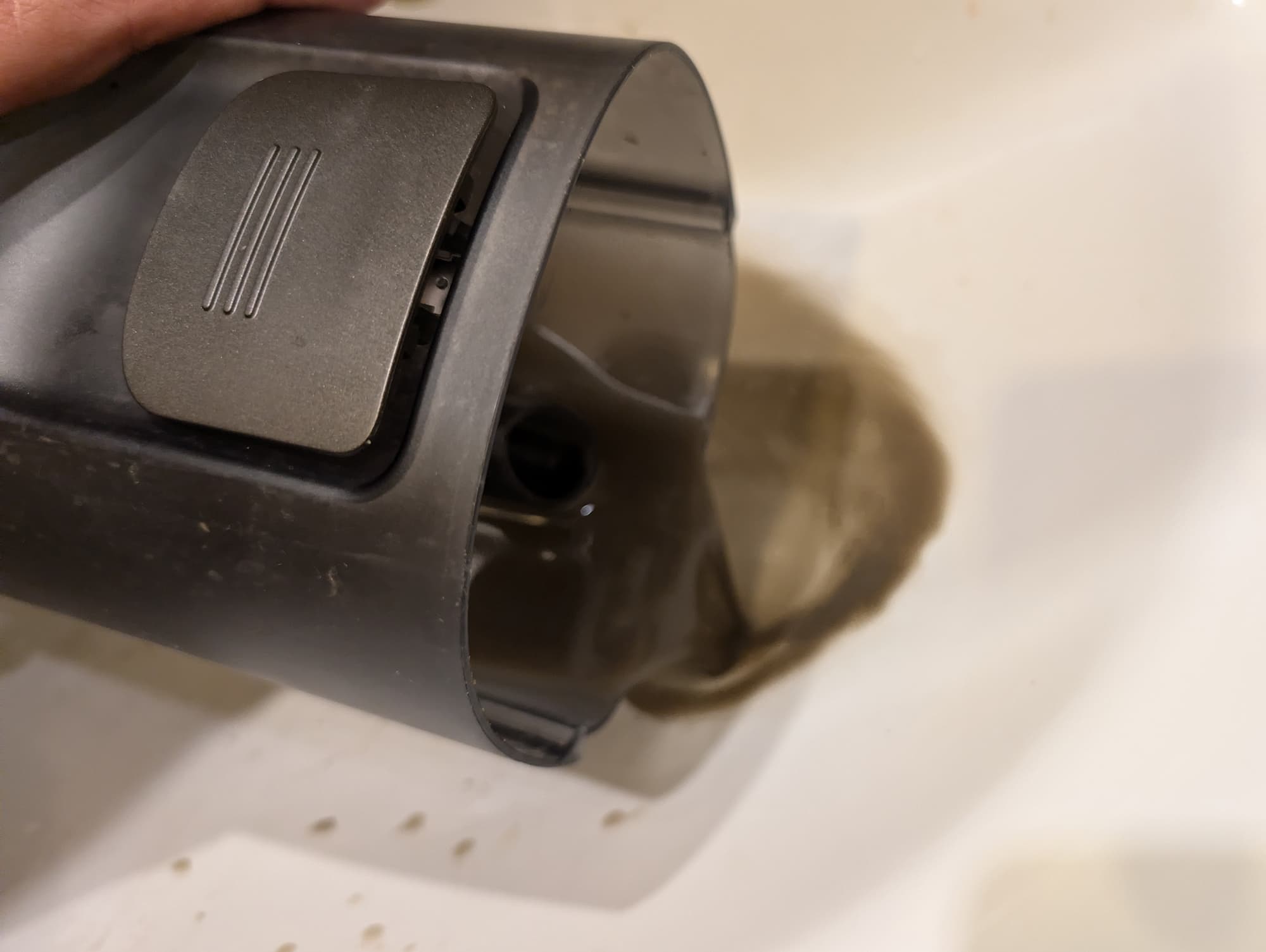 Резервуар для грязной воды и мусора крепится спереди и удерживается с помощью подпружиненной защелки.
