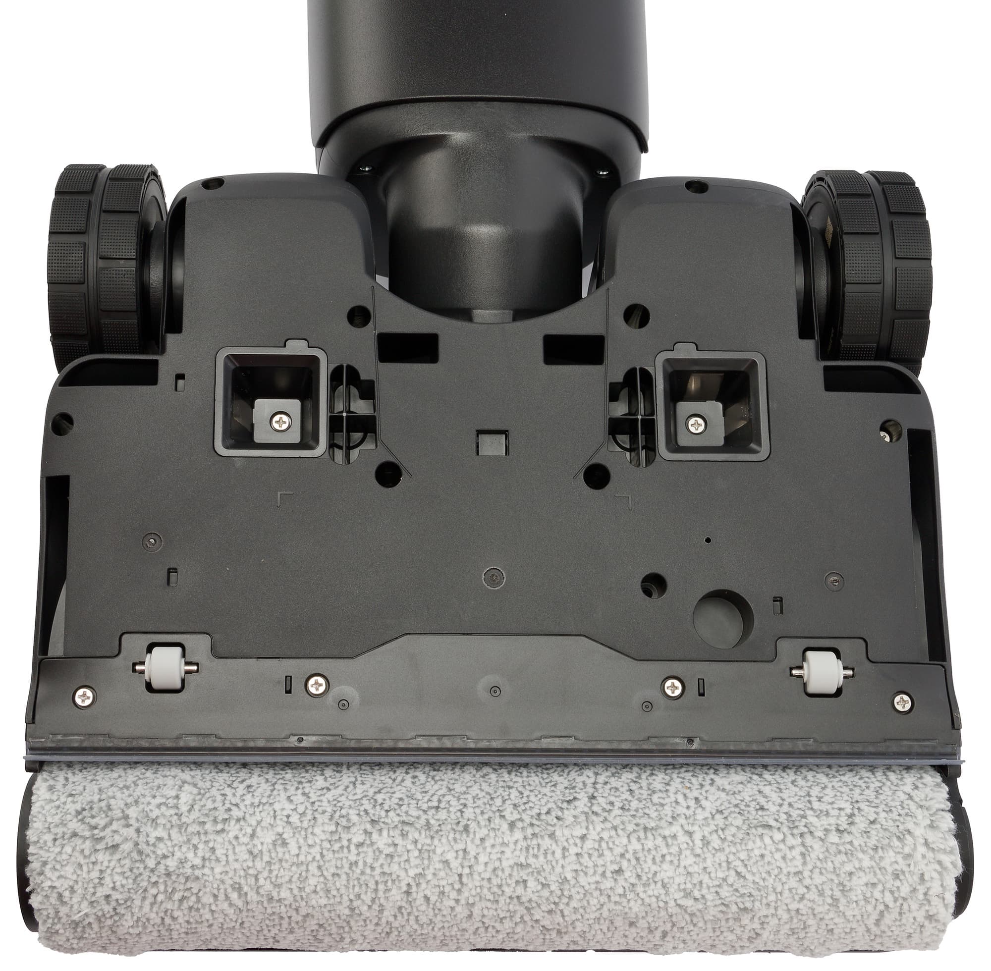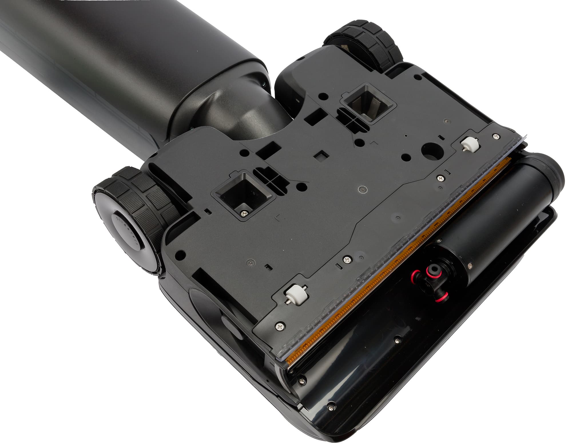 Двигатель ротора расположен внутри пустотелой щетки: такая конструкция занимает значительно меньше традиционного ременного привода минимизирует мертвые зоны справа и слева, позволяя подметать и мыть вплотную к стенам и плинтусам. Производитель сообщает, что ширина необслуживаемой зоны у этой модели не превышает миллиметра.