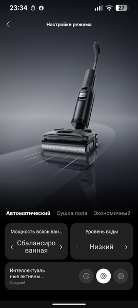 Скорость щетки и интенсивность увлажнения можно настроить в мобильном приложении — отдельно для каждого режима. Хотя предустановленные по умолчанию настройки вполне адекватны, сама возможность сконфигурировать устройство под себя показалась нам полезной и нужной. Такой опции в моющих пылесосах мы до сих пор не встречали.